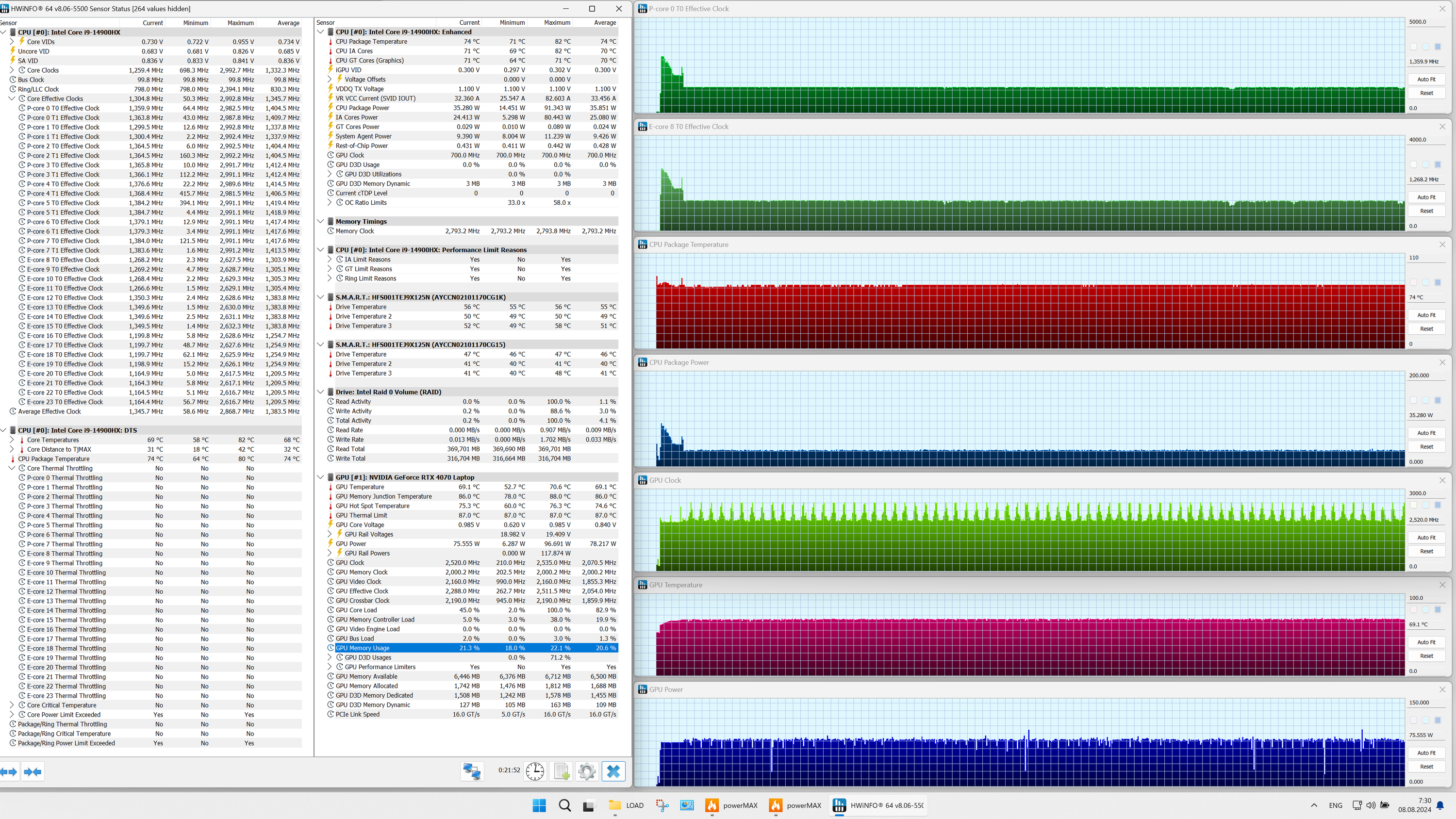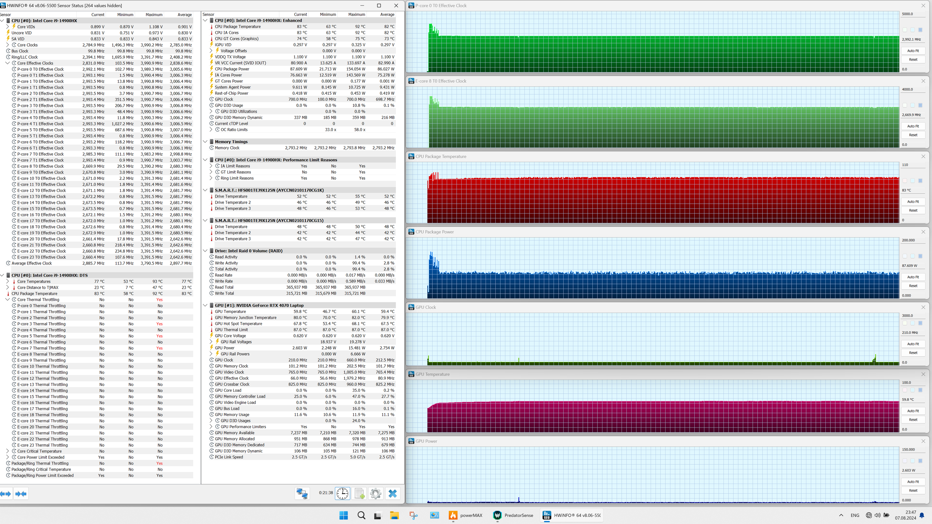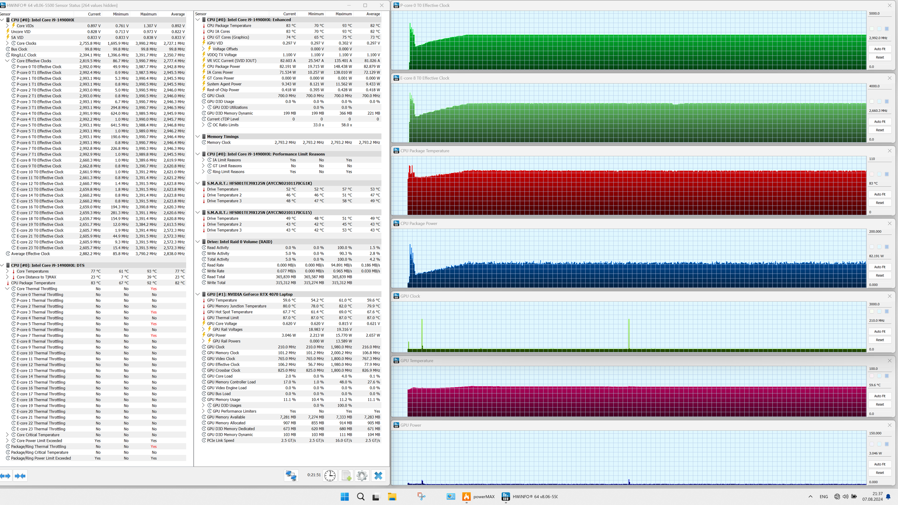 | Процессор | Intel Core i9-14900HX: 8 P-ядер/16 потоков (2,2/5,8 ГГц), 16 E-ядер (1,6/4,1 ГГц), TDP 45 Вт (45—55/157 Вт), Tjmax 100 °C | |
