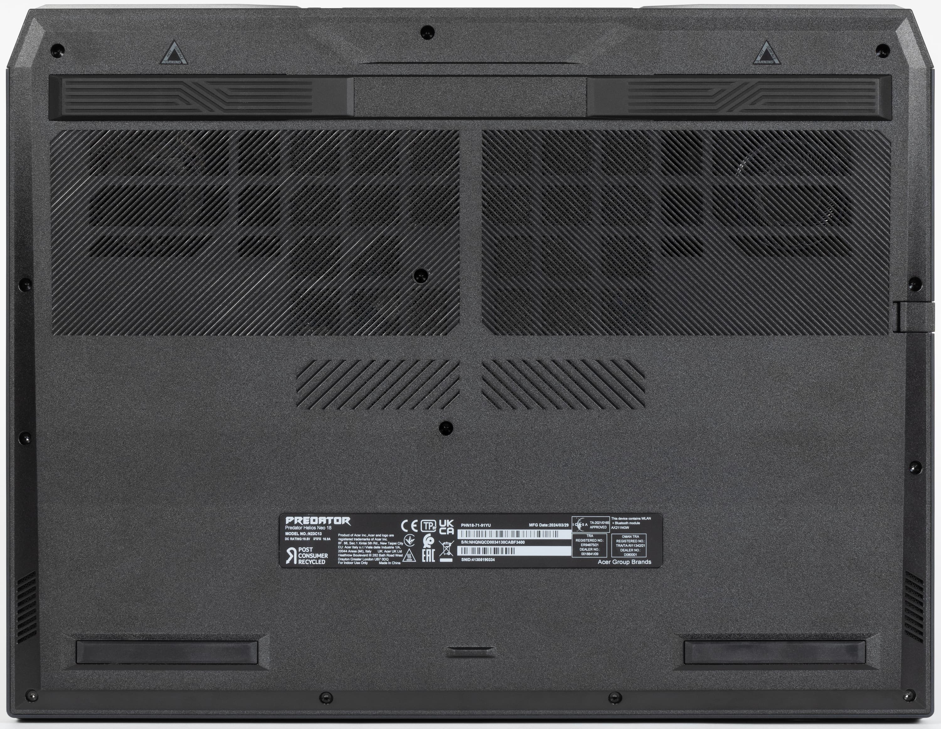В интернет-каталоге производителя Acer Predator Helios Neo 18 представлен в трех модификациях. Все они обладают 18-дюймовыми экранами с разрешением WQXGA (2560×1600), но различаются частотой обновления (младшие модели — 165 Гц, старшая — 240 Гц) и, что наиболее важно, разными моделями процессоров 14-го поколения (20-ядерный Intel Core i7-14700HX Icosa-core у младших, 24-ядерный Intel Core i9-14900HX Tetracosa-core у старшей) и видеокарт (Nvidia GeForce RTX 4060 Laptop с 6 ГБ или 8 ГБ GDDR6 у младших и Nvidia GeForce RTX 4070 Laptop с 8 ГБ GDDR6 у старшей), а также объемами ОЗУ (16 или 32 ГБ) и вместимостью системного накопителя (1 или 2 ТБ). Нам посчастливилось иметь дело с самой богатой конфигурацией (Acer Predator Helios Neo 18 PHN18-71).