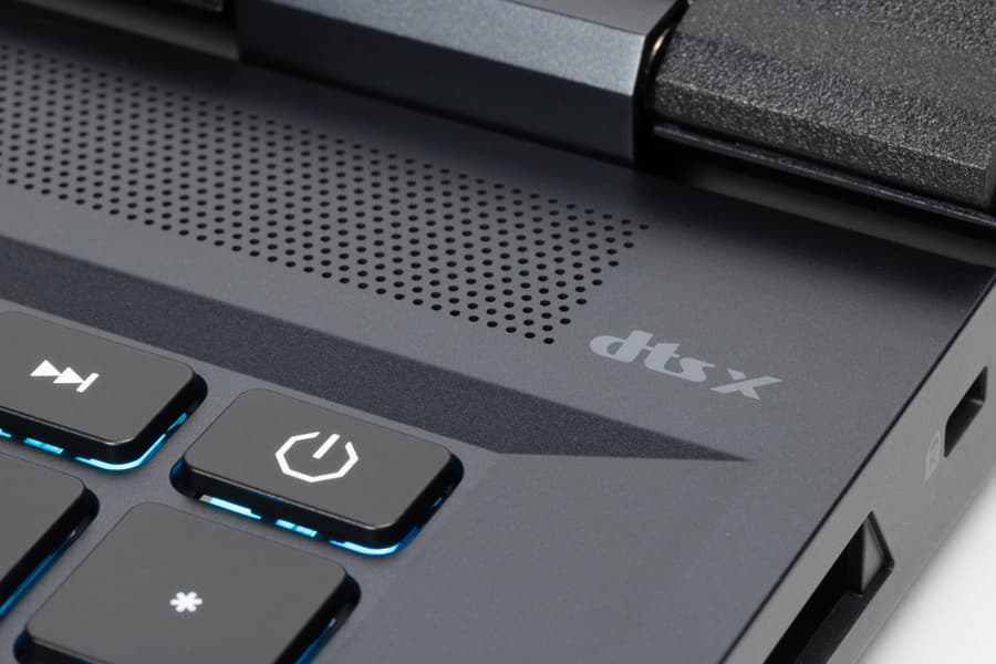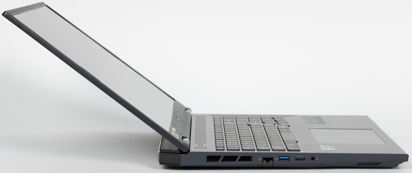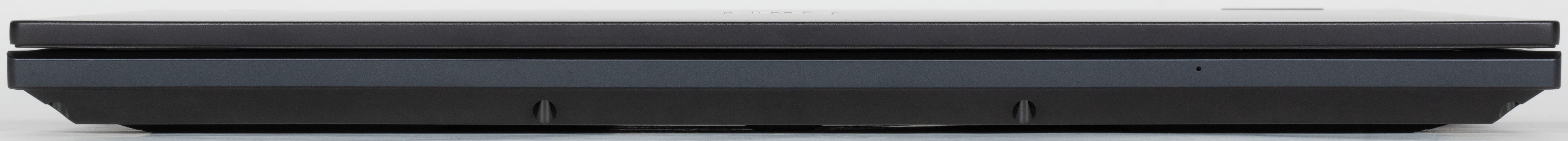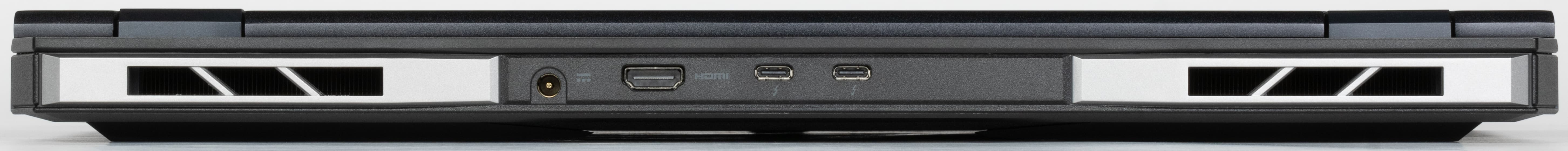 На задней панели слева и справа расположены решетки, через которые из внутреннего объема ноутбука наружу эвакуируется нагретый воздух. Между этими решетками помещаются в ряд коаксиальный разъем для подключения адаптера питания, видеовыход HDMI и два разъема USB Type-C (Thunderbolt 4).