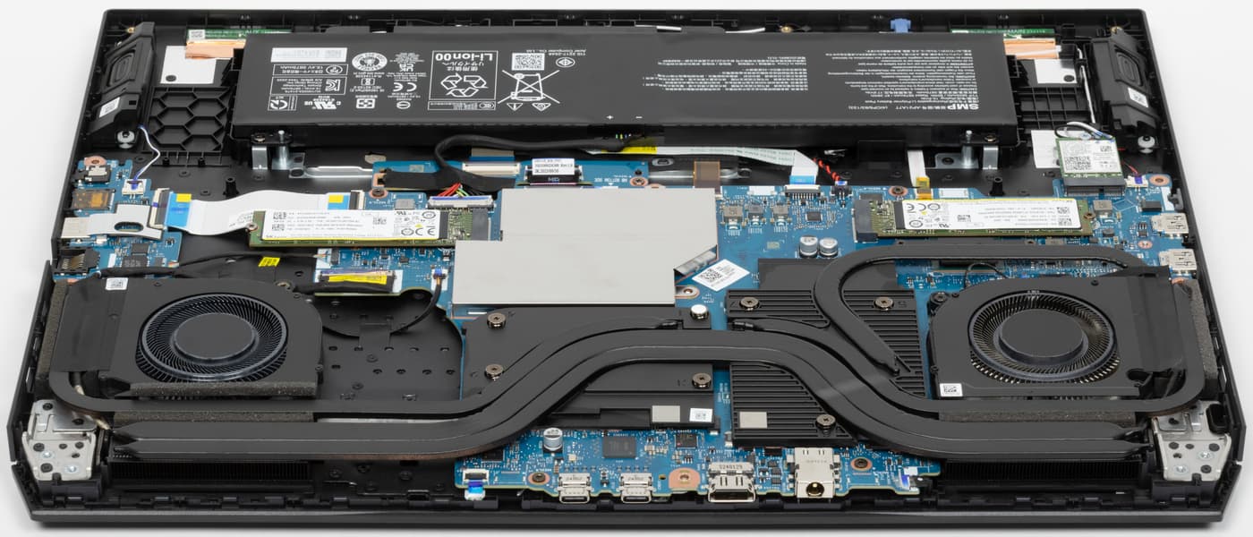 Наиболее приметные узлы конструкции — система охлаждения, блок со слотами SO-DIMM (на фото скрыт под накладкой) и аккумулятор. Системная плата дополнена левым сателлитом (на фото — справа), где установлены розетка RJ-45, порт USB Type-A, картовод и комбинированный аудиоразъем для гарнитуры. Аппаратная модернизация предусматривает возможность изменения конфигурации оперативной памяти, замену беспроводного адаптера и аккумулятора. В принципе, можно поменять и оба накопителя, заменив их более вместительными, но стоит ли это делать, не ясно.