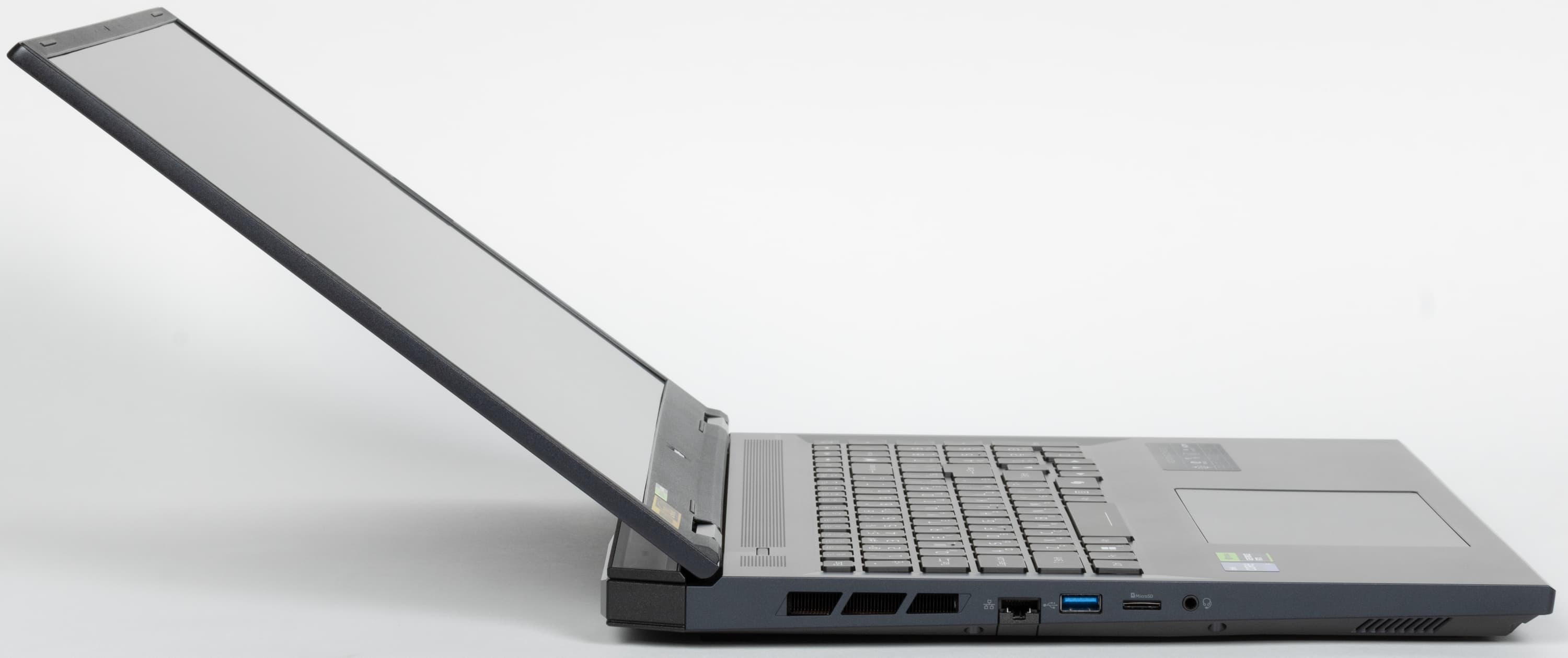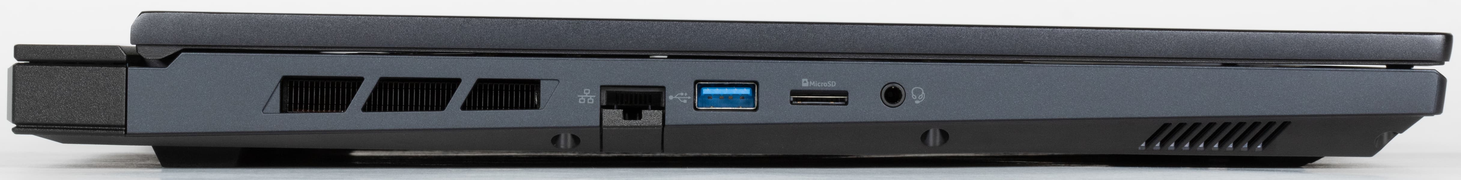 На левой боковой панели помещены боковая решетка выходного отверстия системы охлаждения, розетка RJ-45, порт USB 3.2 Gen1 Type-A, слот картовода для microSD и комбинированный миниджек для подключения гарнитуры.