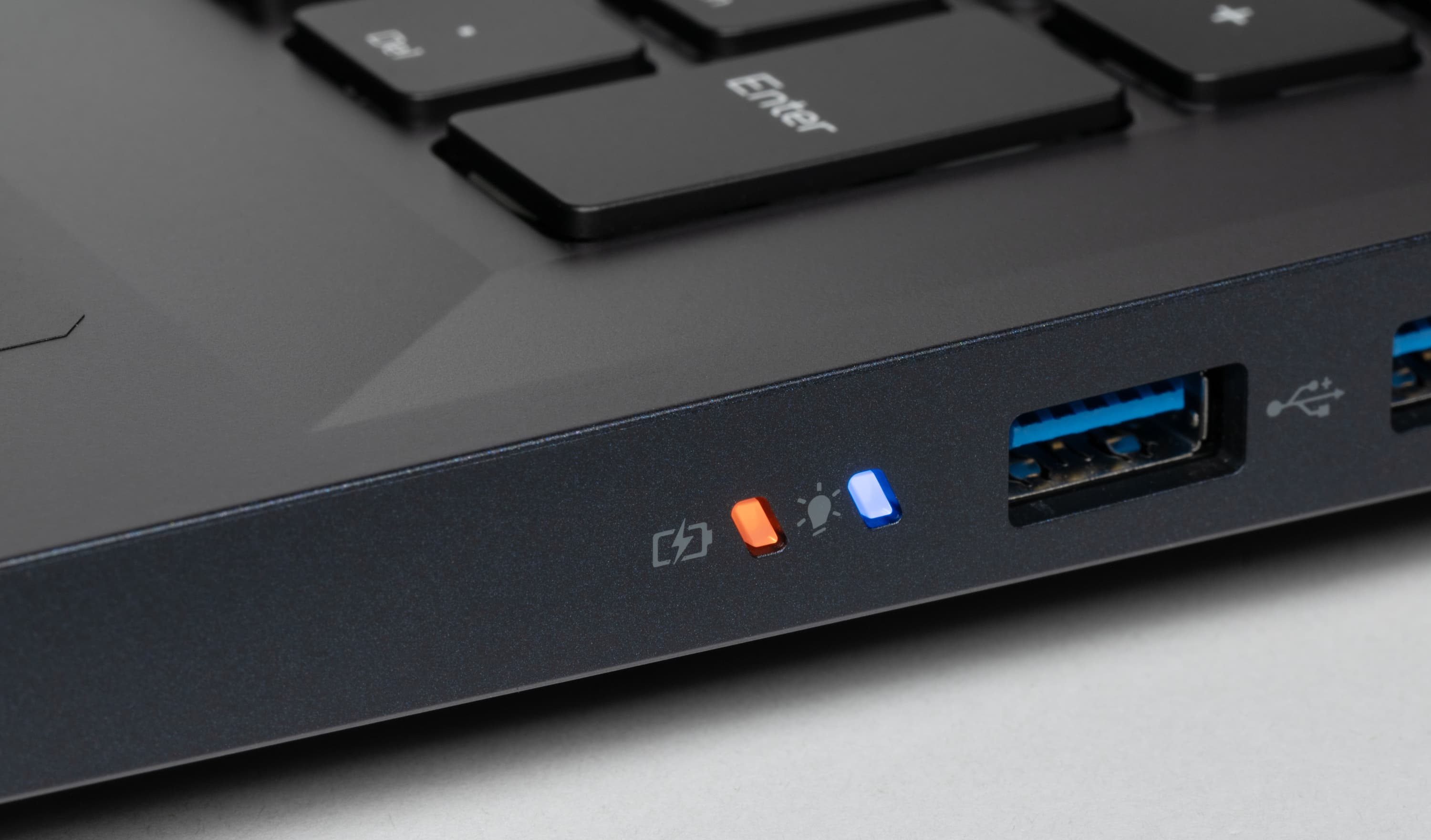 Левый светодиод на панели сигнализирует от заряде батареи, правый — о подключении адаптера питания.