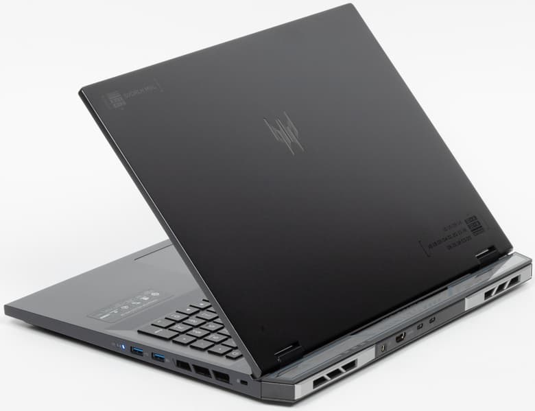 Корпус ноутбука изготовлен из пластмассы, поверхности которой легко и быстро собирают отпечатки пальцев. На крышке красуется логотип игровой серии Predator. При включении питания он может подсвечиваться в соответствии с цветовой схемой и динамикой, определяемыми пользователем.