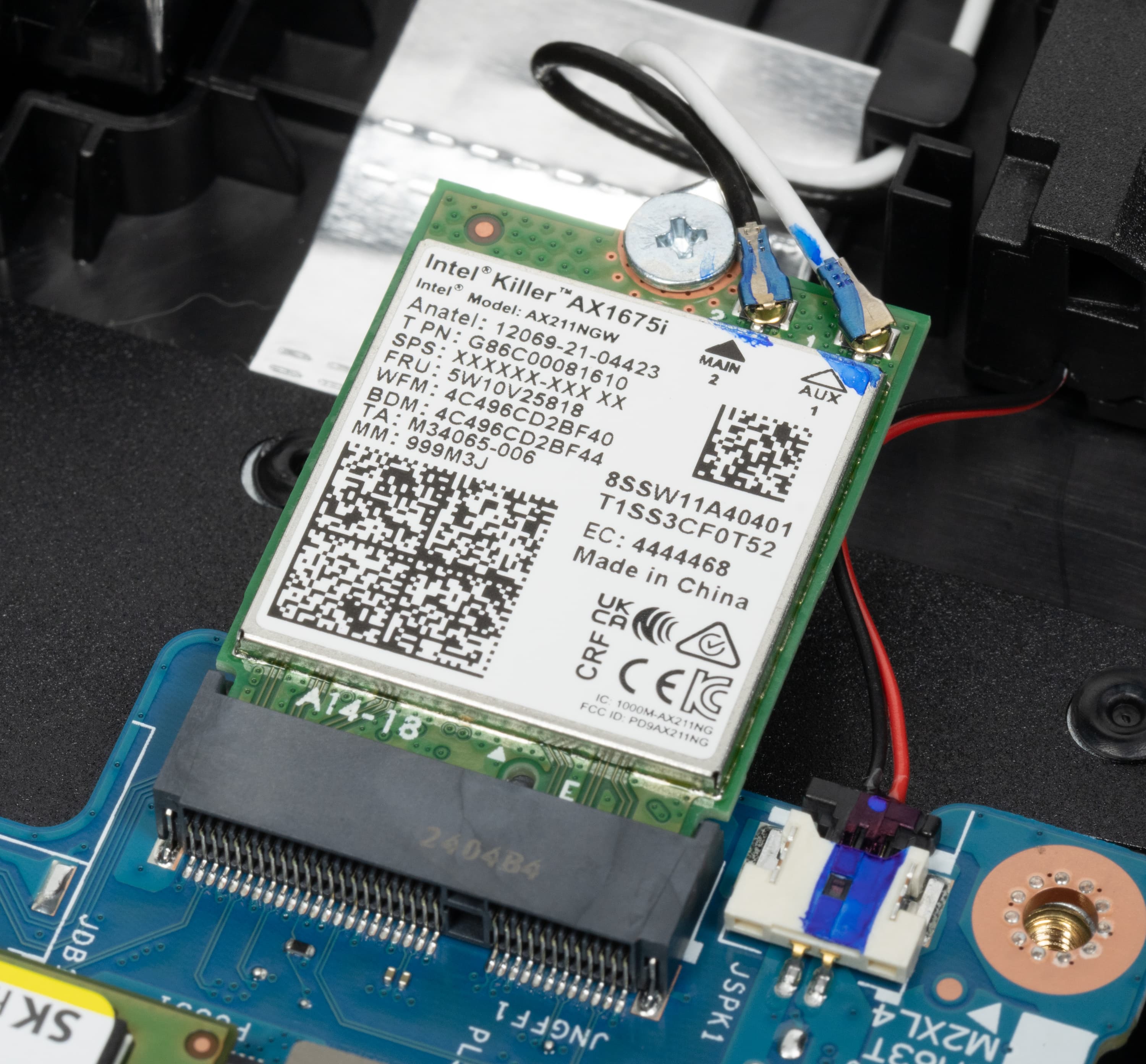 Адаптер беспроводной связи — трехдиапазонный (2,4/5/6 ГГц) Intel Killer AX1675i, или AX211NGW (Garfield Peak) по старой номенклатуре. Он соответствует классу Wi-Fi 6E, поддерживает стандарты связи 802.11ax и обеспечивает одновременный прием и передачу сигнала с помощью двух антенн при множественных одновременных подключениях (2×2 MIMO), то есть представляет собой вполне современное, хорошо проверенное и отлично себя зарекомендовавшее устройство.
