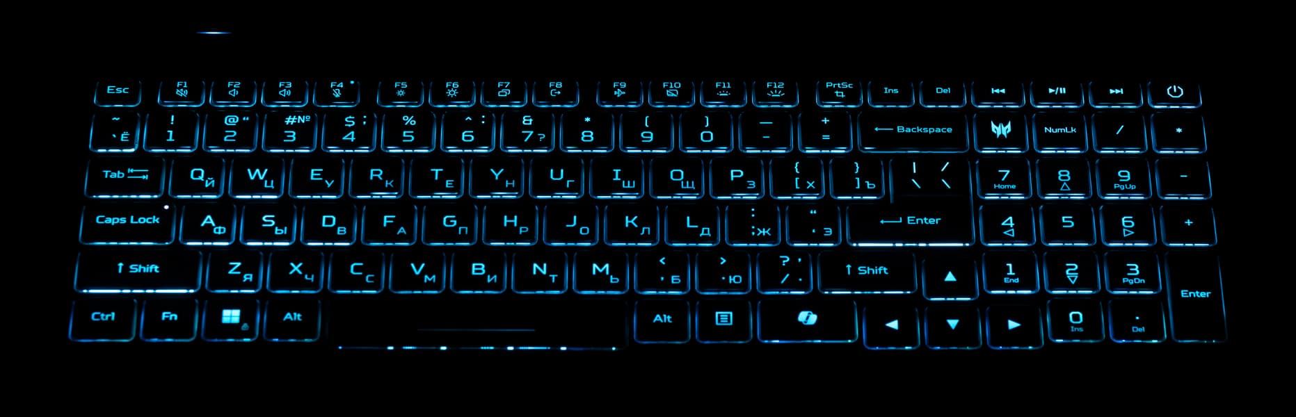 Подсвечиваются символы и значительно сильнее — контуры клавиш. Распределение света и специфика маркировки позволяют хорошо видеть и латинские, и кириллические символы.