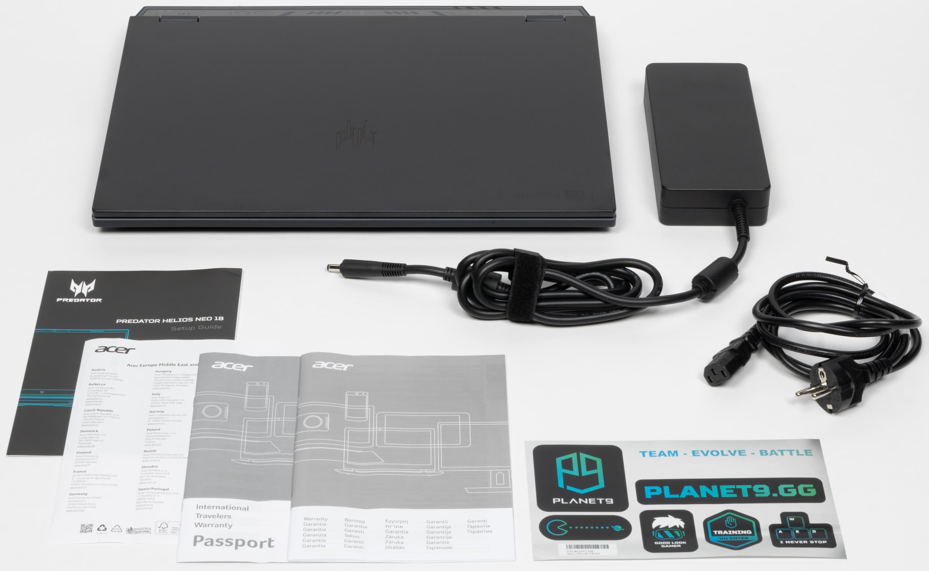 В комплекте поставки помимо самой машины и адаптера питания с кабелем имеются лишь традиционно обязательные печатные материалы и листок со стикерами Planet9 — игрового сообщества Acer (см. сайт planet9.gg).