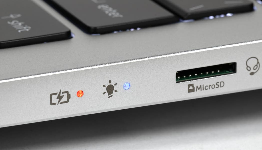 На правой боковой панели имеются два светодиодных индикатора (зарядки батареи и запуска ноутбука), слот картовода для microSD, комбинированный аудиоразъем, еще один порт USB Type-A и кенсингтонский замок.