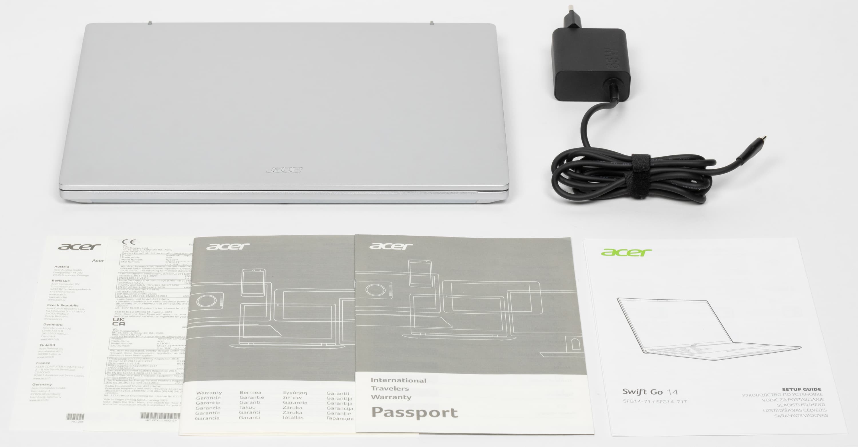 Отклонение крышки при раскрытии достигает 132°. Acer Swift Go 14 обладает 14-дюймовым экраном и поэтому весьма компактен даже по сравнению с 16-дюймовыми моделями. Соотношение сторон 16:10 вместо традиционных 16:9 увеличивает размер дисплея по вертикали и делает машину визуально более габаритной, но и обеспечивает более удобную работу с офисными приложениями. Вес 1,28 кг представляется небольшим по меркам более габаритных портативных машин.