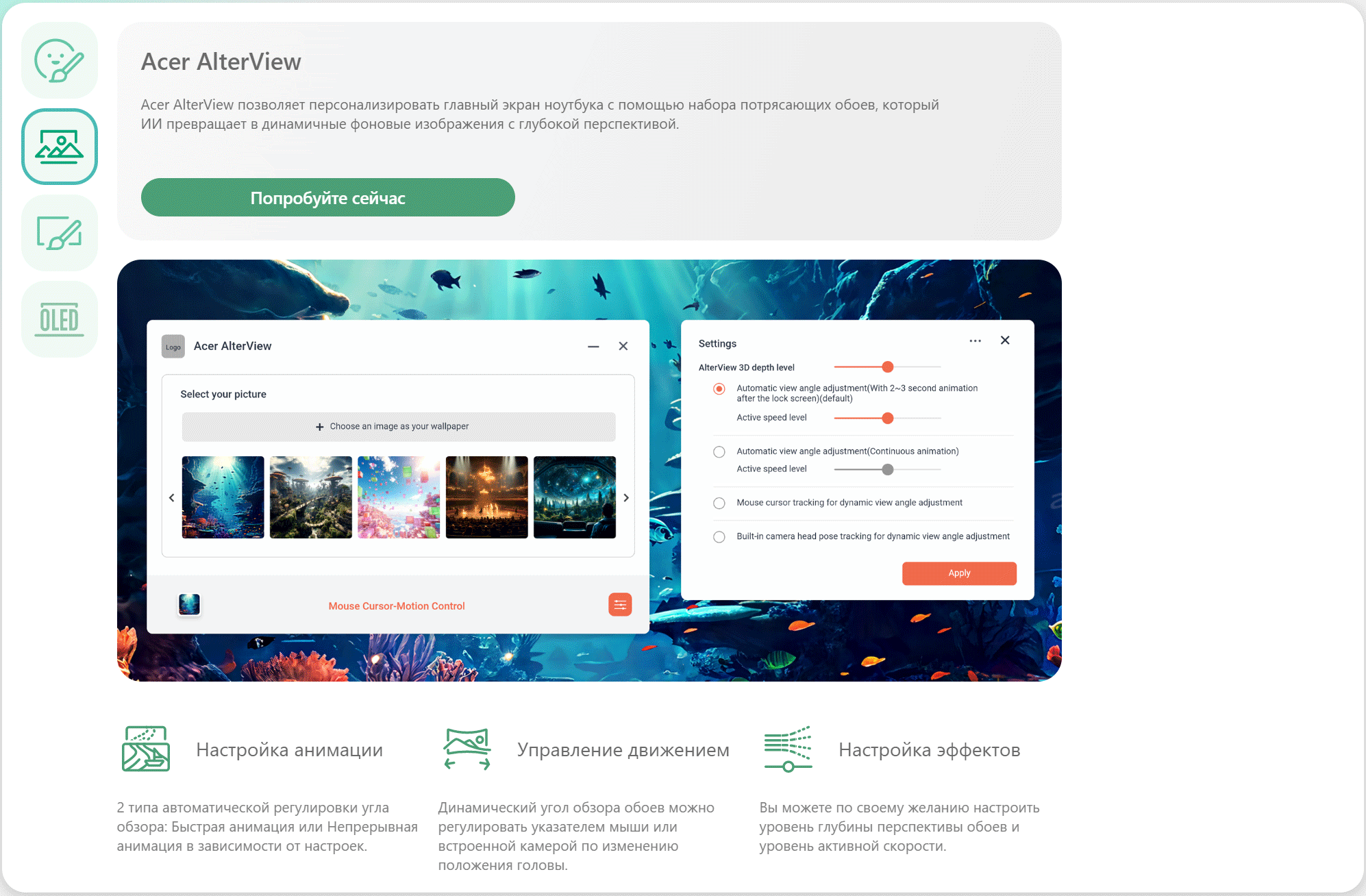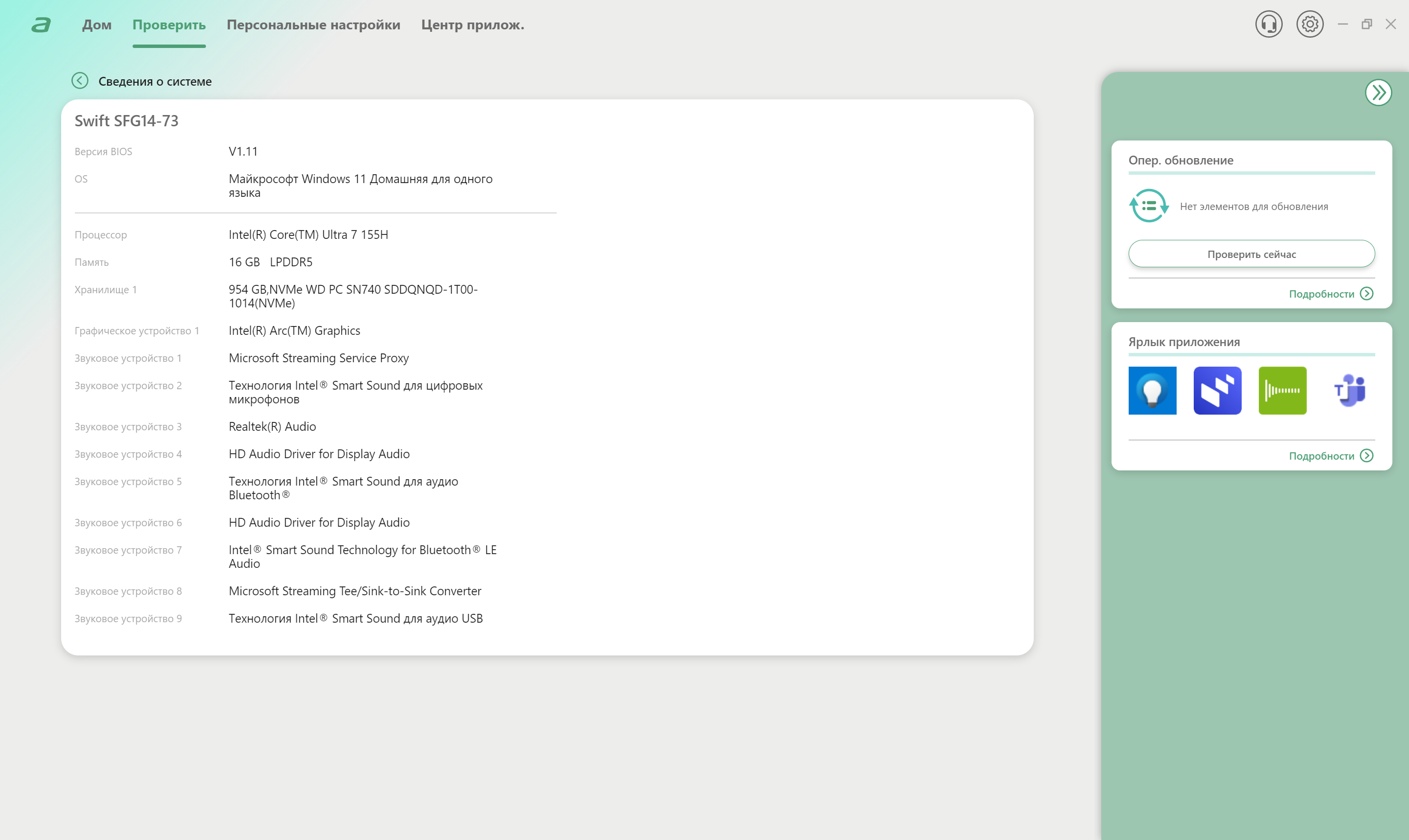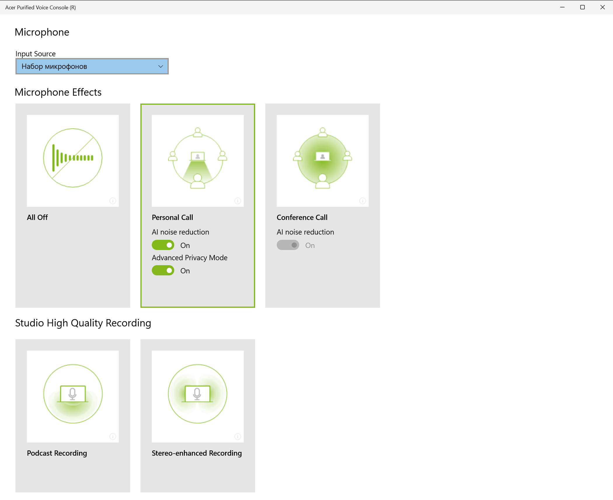 Обеспечивается доступ к различным приложениям, включая Acer Purified Voice Control — его назначение понятно из скриншота, отметим лишь, что для улучшения шумоподавления при использовании микрофонов задействуются функции искусственного интеллекта (ИИ, AI).