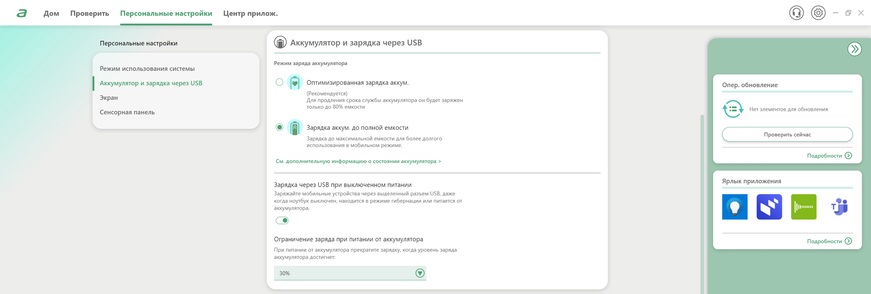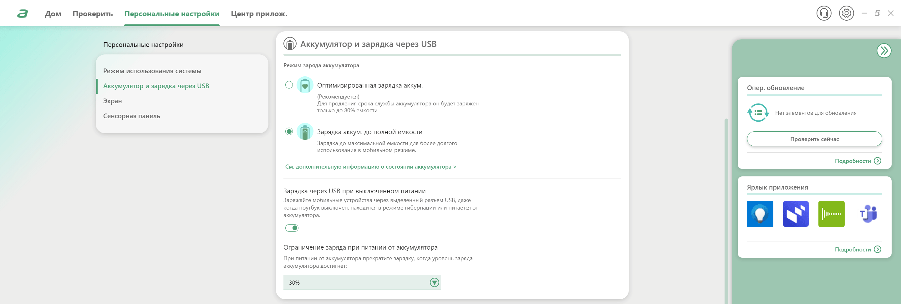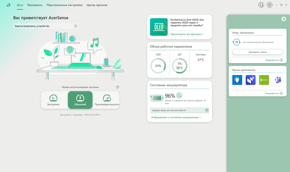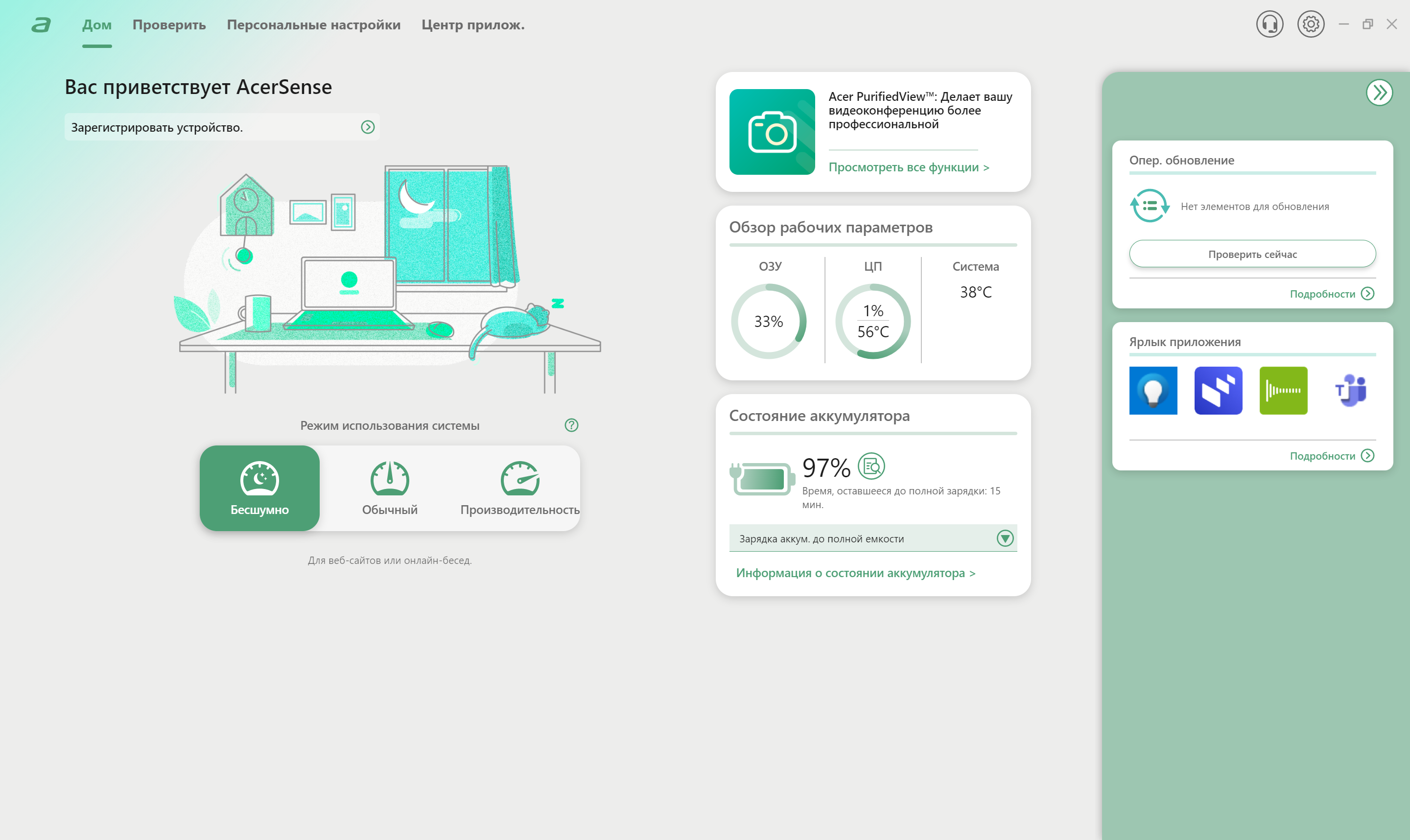 Можно выбрать один из трех профилей (режимов) использования системы, бесшумный предназначен для путешествий по интернету или видеоконференций, обычный — для офисных задач, производительный — для ресурсоемких приложений, включая игры. После перезагрузки выбор сохраняется.