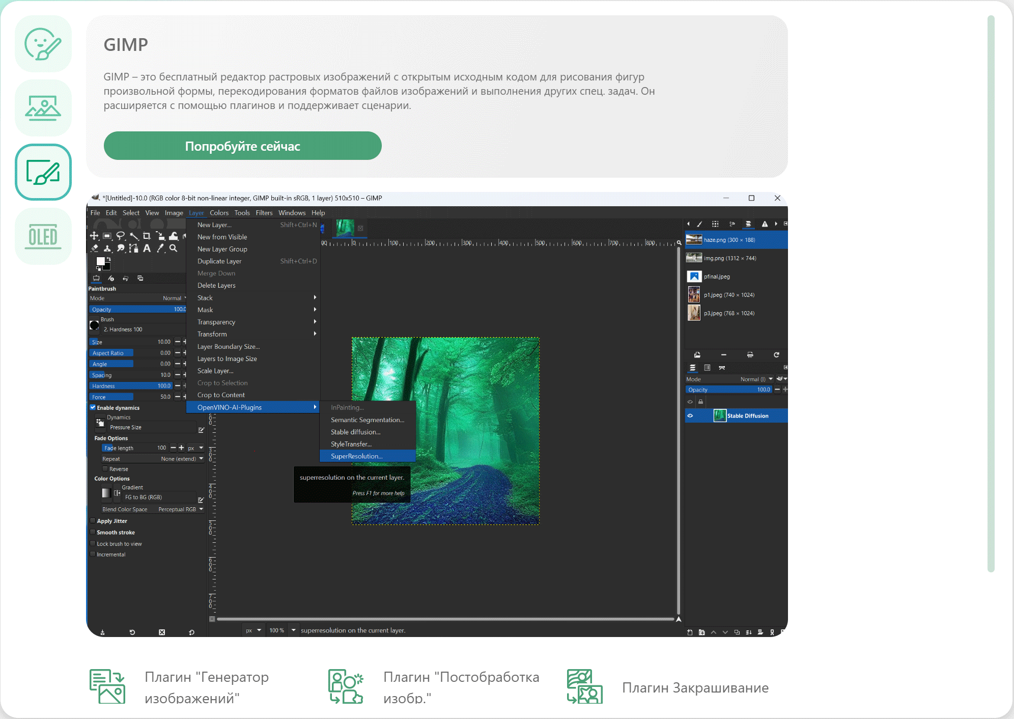 Другие приложения, использующие ИИ, это Acer LiveArt для создания стикеров из фотографий, Acer AlterView для получения динамичных фоновых картинок с глубокой перспективой, бесплатный редактор растровых изображений GIMP (для работы с искусственным интеллектом потребуются соответствующие плагины).