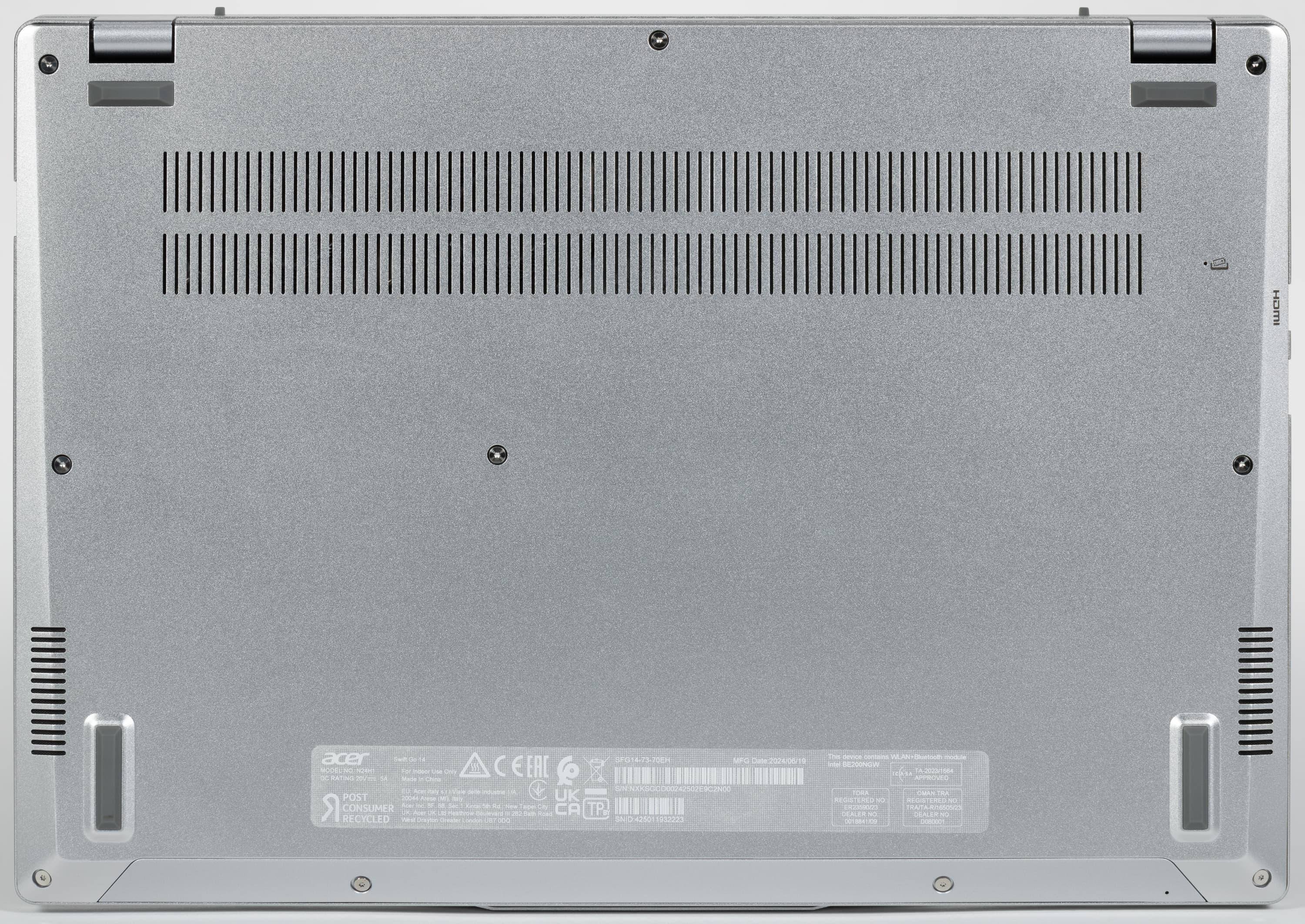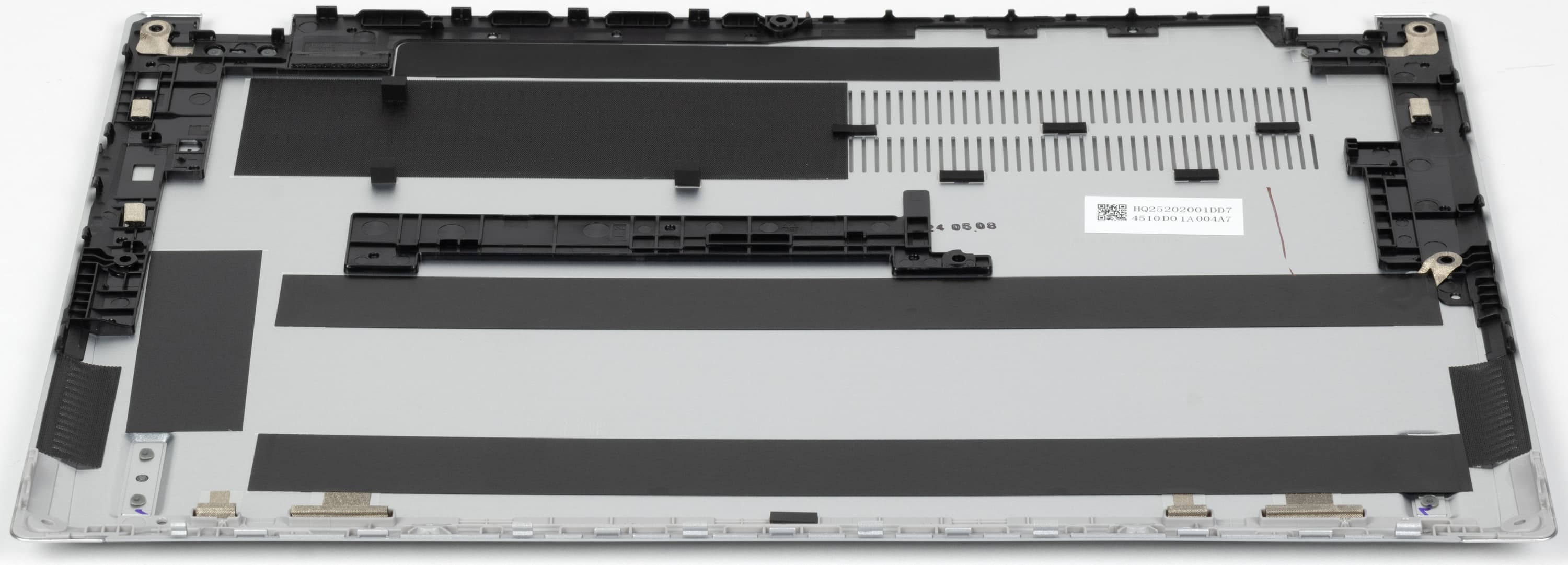 На днище, кроме четырех ножек, ближе к задней кромке имеется вентиляционная решетка, через которую происходит забор воздуха для охлаждения компонентов, поэтому ставить ноутбук на мягкую поверхность не следует.