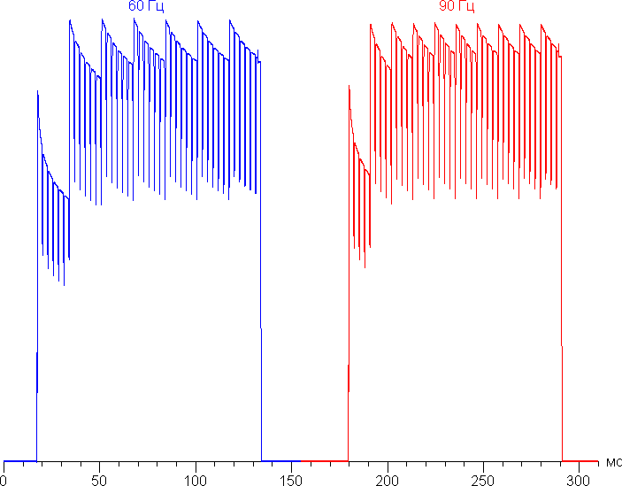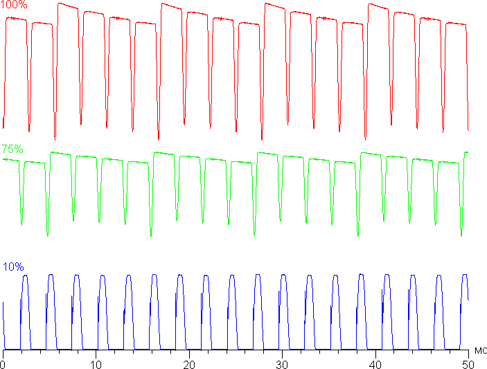 На любом уровне яркости присутствует значимая модуляция с частотой 360 Гц. На рисунке ниже приведены зависимости яркости (вертикальная ось) от времени (горизонтальная ось) для нескольких значений настройки яркости (зависимость реальной яркости от %% шкалы очень нелинейная):