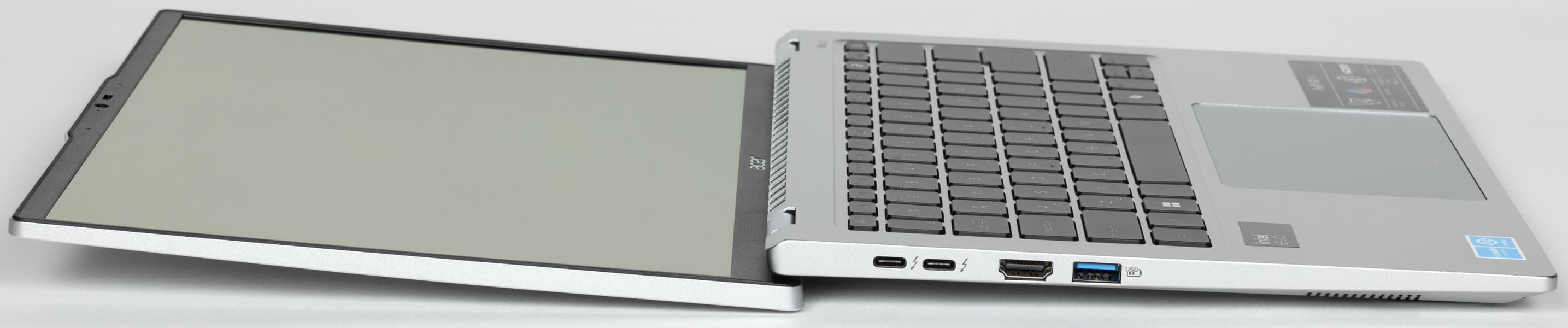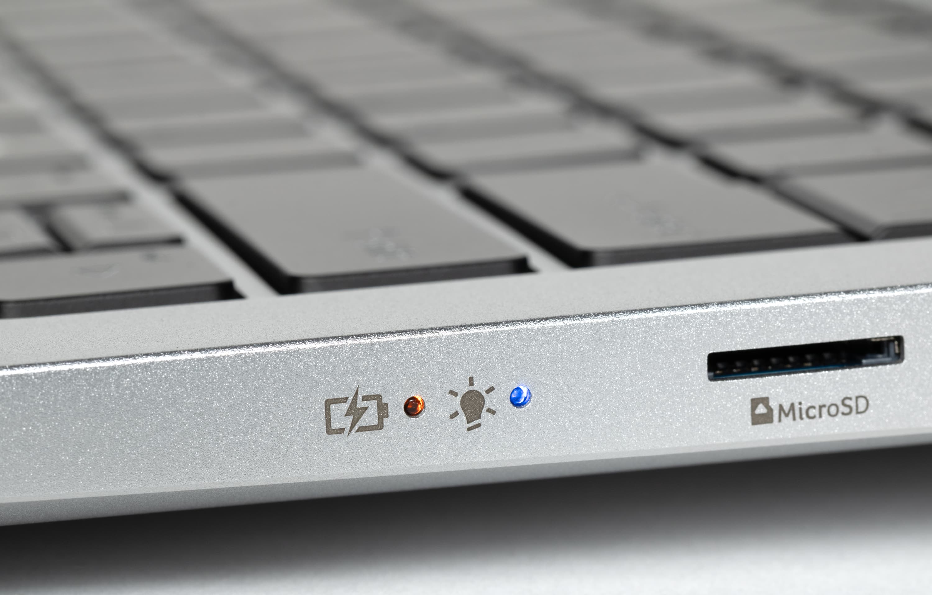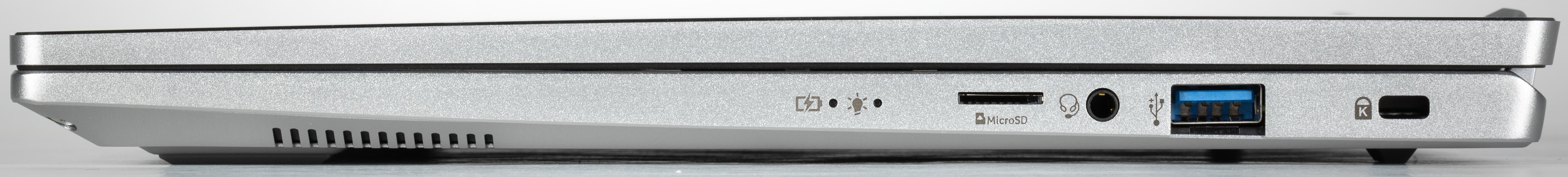 Справа находятся два индикатора (состояния батареи и включения питания), прорезь картовода microSD, комбинированное гнездо под миниджек аудиогарнитуры и второй порт USB 3.2 Gen1 Type-A. Ближе к заднему торцу есть отверстие кенсингтонского замка.
