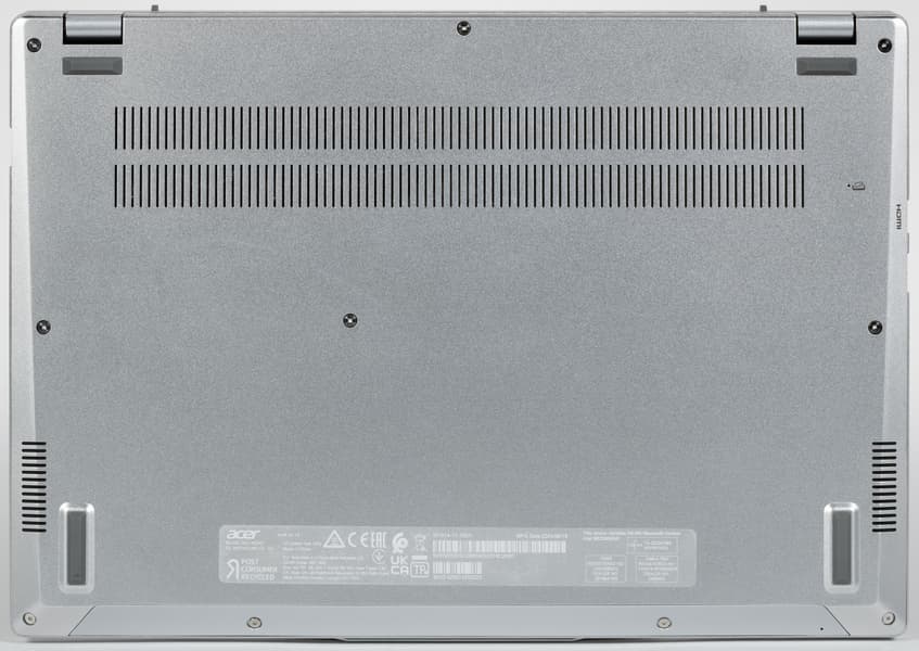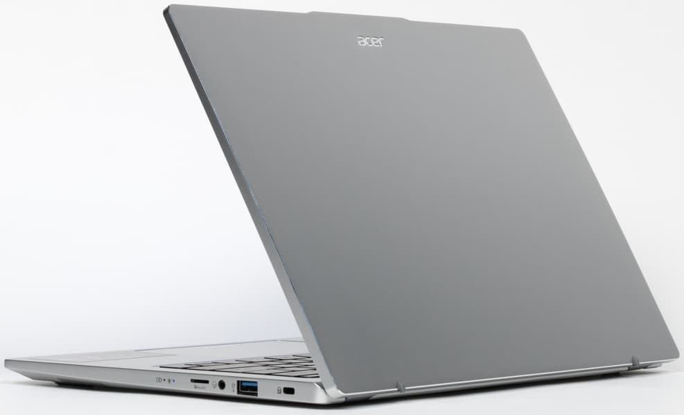 Дизайн общий для ноутбуков Acer Swift Go, каких-либо украшений минимум — название компании некрупными буквами на верхней крышке и надпись «Swift» в передней части тачпада, которая подсвечивается при включенном питании. А грани корпуса оформлены узенькой шлифованной фаской, которая ненавязчиво облагораживает экстерьер.