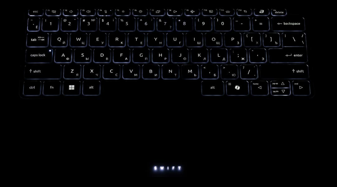 Клавиатура очень похожа на имеющуюся в уже знакомой нам модели Acer Swift Go 14 (SFG14-71-72QX) — мембранного типа с островным расположением кнопок и без цифрового блока, клавиши со стрелками вверх и вниз имеют «половинную» высоту. Но место правой Ctrl занимает кнопка управления дополнительными функциями, еще одна такая кнопка находится в ряду функциональных клавиш между F12 и Ins/Delete. Нанесенные на кнопки символы латиницы гораздо крупнее кириллических.