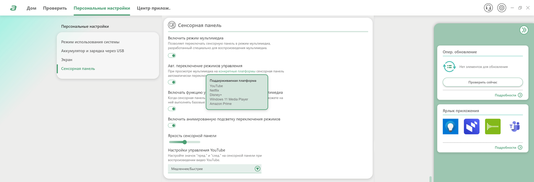 С ее помощью можно управлять сенсорной панелью, включая регулировку яркости подсвечиваемых элементов, которые не ограничиваются упоминавшейся выше надписью «Swift»: при воспроизведении мультимедиа с помощью Media Player на тачпаде задействуются и подсвечиваются управляющие кнопки, в том числе «Play/Pause» и регулировка громкости. Подобные кнопки появляются и для плееров некоторых онлайн-платформ, включая YouTube.