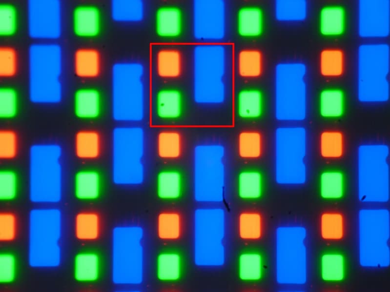 В экране ноутбука используется матрица типа OLED — активная матрица на органических светодиодах. Полноцветное изображение создается с помощью субпикселей трех цветов — красного (R), зеленого (G) и синего (B) в равном количестве — по три разного вида на пиксель. Это подтверждается микрофотографией (в красной рамке — фрагмент из одного пикселя):