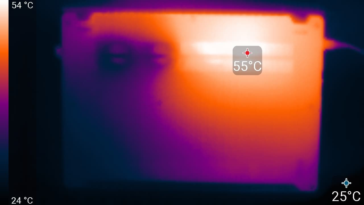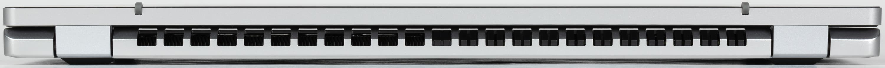 На заднем торце корпуса есть более крупные прорези, через которые система вентиляции выбрасывает нагретый воздух. Получается подогрев нижней части экрана, но во время запуска «тяжелых» тестов выяснилось: слева не особо ощутимый, а справа, где расположен радиатор с вентиляторами (см. ниже), более заметный, хотя и не критически высокий.