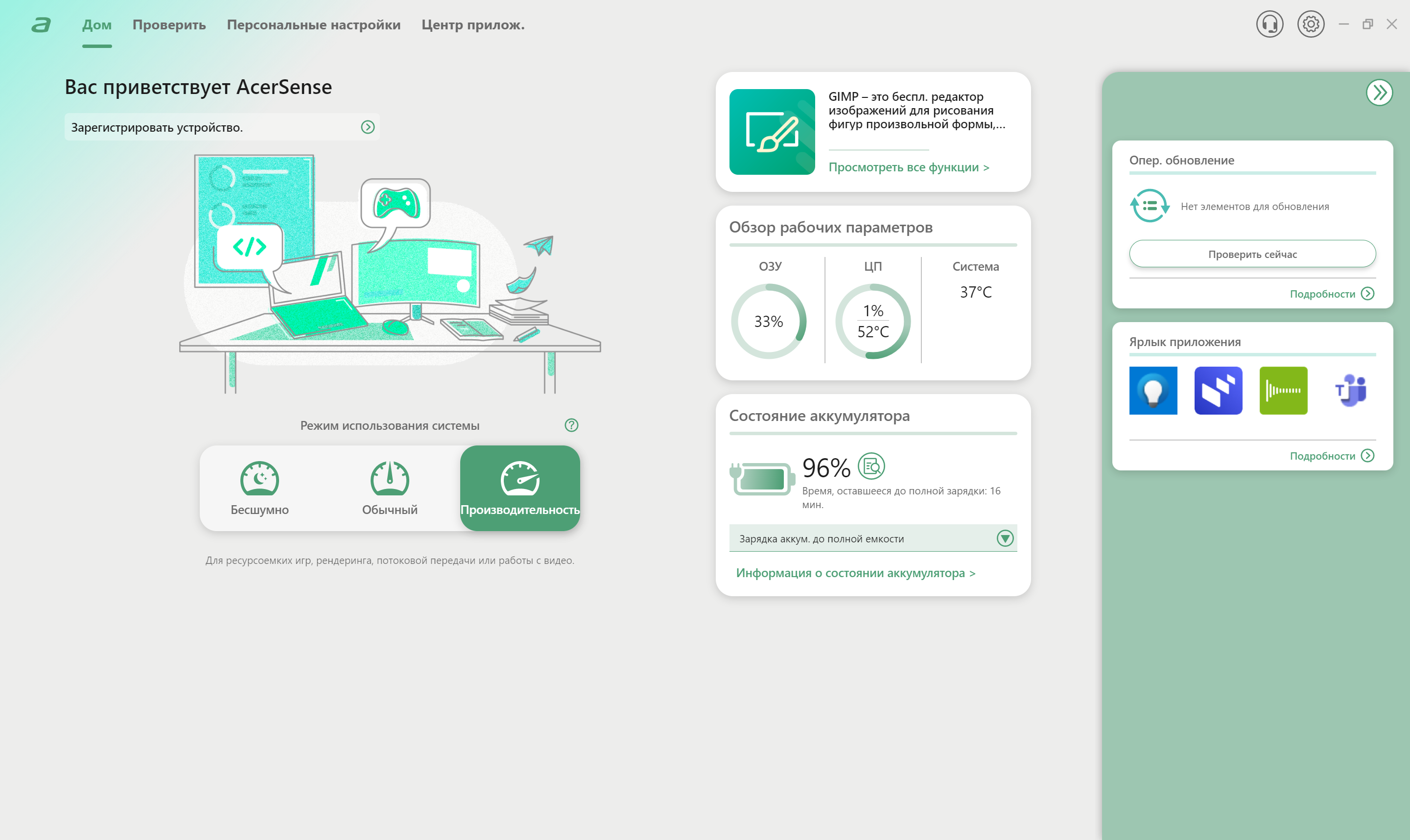 Для нашего Acer Swift Go 14 в утилите AcerSense выбираем режим «Производительность».
