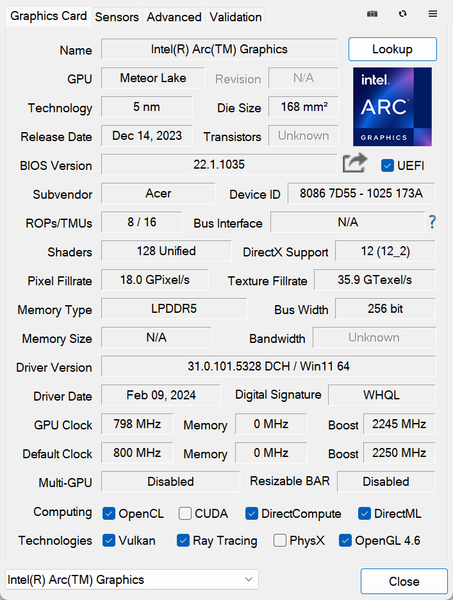 Интегрированный видеоадаптер Arc Graphics процессора Intel Core Ultra 7 155H имеет восемь ядер. Работает он на частотах до 2250 МГц, TGP до 28 Вт.