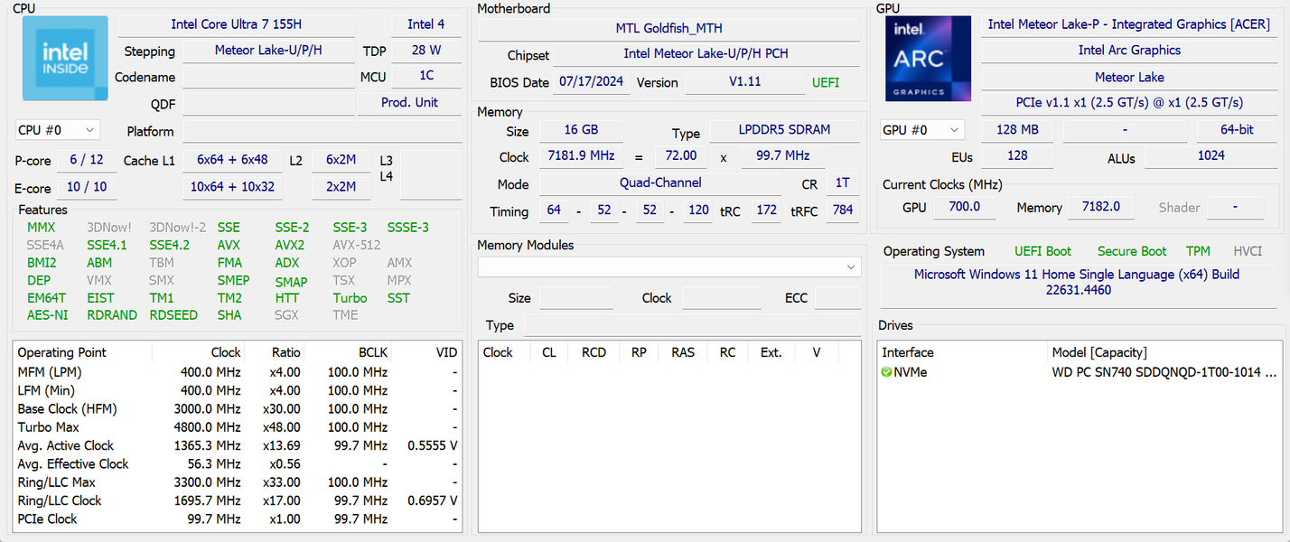 - Honor MagicBook Pro 16 (DRA-54) с процессором Intel Core Ultra 5 125H (4+8+2 ядер/18 потоков, до 1,2/4,5 ГГц, 20-28/115 Вт), интегрированное видео Intel Arc Xe-LPG Graphics (2,2 ГГц, 7 ядер), ОЗУ 24 ГБ LPDDR5, SSD 1 ТБ PCIe 4.0 ×4;