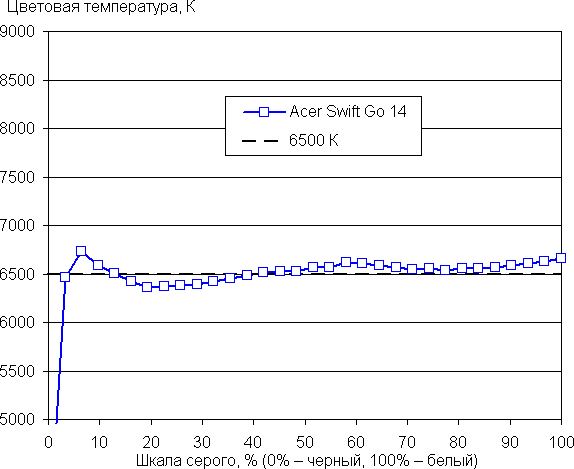При питании от сети или от батареи и при ручном управлении яркостью ее максимальное значение в режиме SDR составило 377 кд/м² (в центре экрана на белом фоне). Максимальная яркость довольно высокая. Если избегать прямого солнечного света, то даже такое значение позволит с относительным комфортом использовать ноутбук на улице летним солнечным днем.