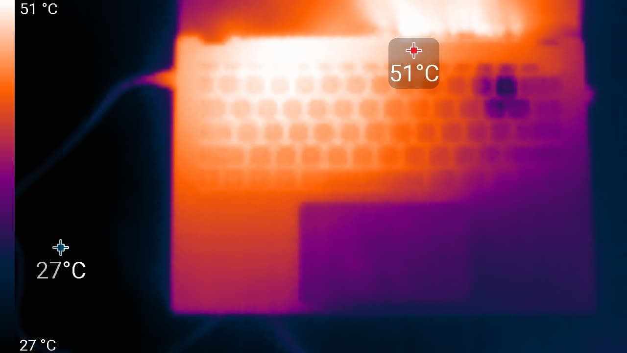 К сожалению, система охлаждения не всегда справляется со своей задачей: при серьезной нагрузке наблюдаются перегрев и тротлинг, работает ноутбук при этом довольно шумно, да и нагрев поверхностей корпуса в реальных сценариях эксплуатации заметный.