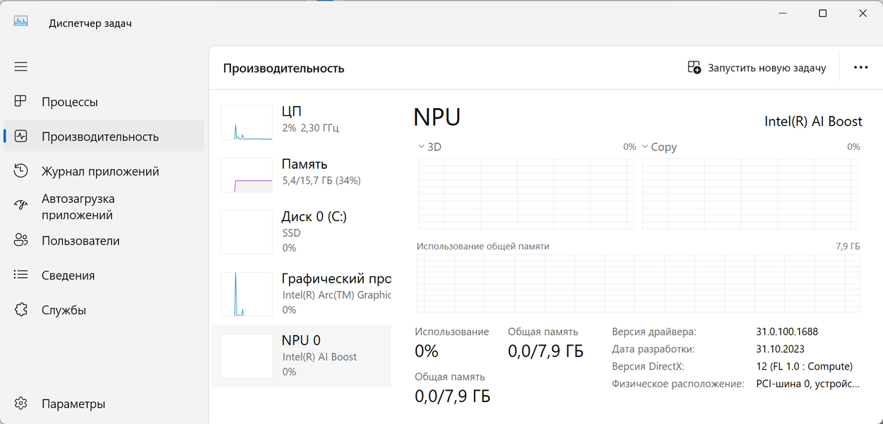 Установленный в ноутбуке CPU Intel Meteor Lake содержит сопроцессор Intel NPU (Neural Processing Unit), который при использовании соответствующего ПО позволяет задействовать функции ИИ без обращения к внешним ресурсам. В диспетчере задач он отображается как отдельное устройство.