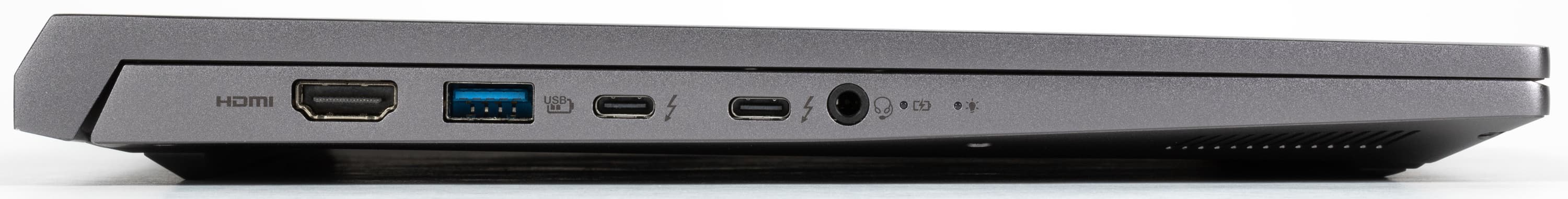 На левой боковой панели имеются видеовыход HDMI, порты USB 3.2 Gen2, два интерфейса Thunderbolt 4 / USB 4 Gen3 (Type-C) и комбинированный аудиоразъем для подключения гарнитуры.