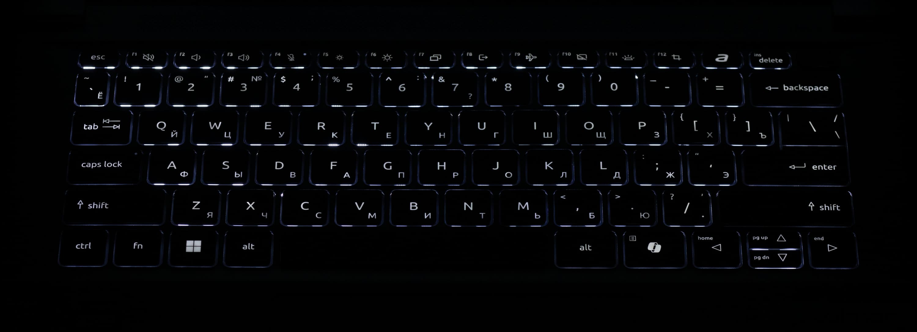 Клавиатура оснащена подсветкой с тремя уровнями яркости. Переключение производится последовательными аккордами «Fn+F11». Подсвечиваются символы на клавишах и немного — их контуры. Зона подсветки под каждой клавишей видна хорошо, но выражена не сильно, поэтому не раздражает. Распределение света и специфика маркировки позволяют хорошо видеть обе раскладки.
