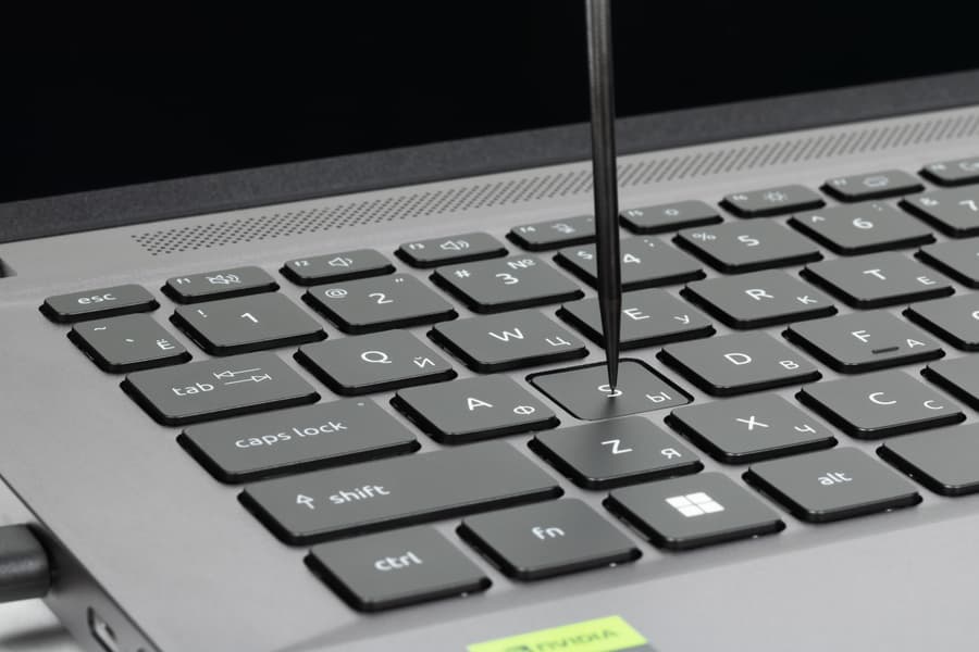 Кнопка включения питания располагается в правом верхнем углу поля клавиатуры и отличается от окружающих внешним видом и наличием отдельного светодиода.