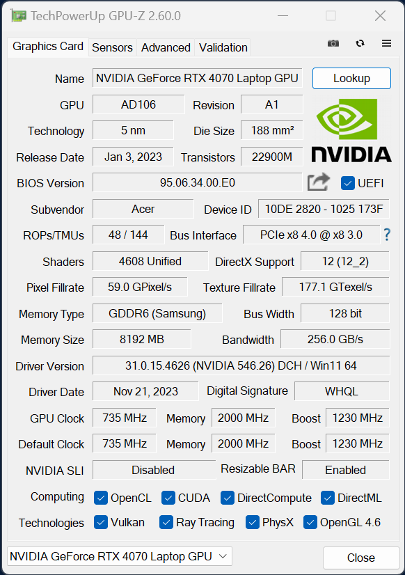 У главного вычислителя ноутбука Acer Swift X 14 имеется интегрированное графическое ядро Intel Arc Graphics, но для игр и приложений, умеющих задействовать дискретный видеоускоритель, установлена видеокарта Nvidia GeForce RTX 4070 Laptop. Сама Nvidia предоставляет производителю портативных машин решать вопрос о выборе мощности, потребляемой дискретным видеоускорителем, предусмотрев диапазон 35—115 Вт. Производитель установил планку на отметке 50 Вт. Нам в ходе тестирования под максимальной нагрузкой удалось получить на 20% больше — 60 Вт.