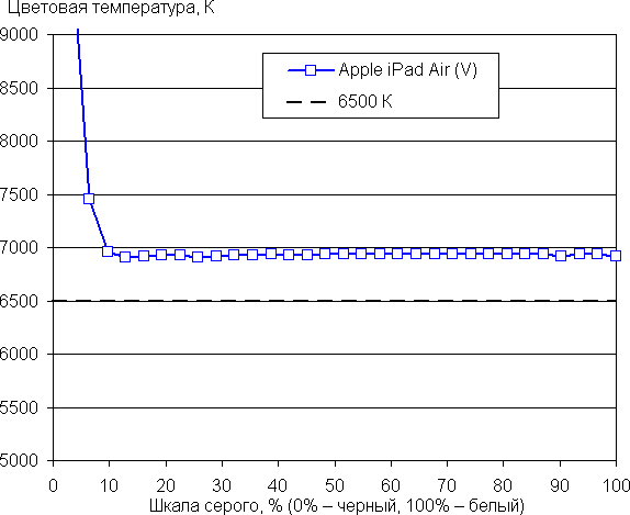 Баланс оттенков на шкале серого хороший, так как цветовая температура близка к стандартным 6500 К, а отклонение от спектра абсолютно черного тела (ΔE) меньше 10, что для потребительского устройства считается приемлемым показателем. При этом цветовая температура и ΔE мало изменяются от оттенка к оттенку — это положительно сказывается на визуальной оценке цветового баланса. (Самые темные области шкалы серого можно не учитывать, так как там баланс цветов не имеет большого значения, да и погрешность измерений цветовых характеристик на низкой яркости большая.)