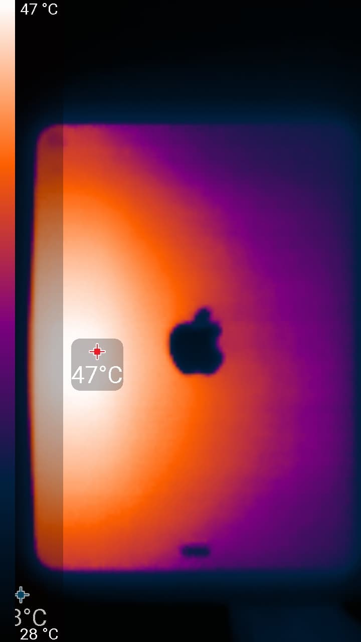 Видно, что нагрев локализован близко к правому краю и ниже центра вертикально, что соответствует расположению микросхемы SoC. По данным теплокамеры, максимальный нагрев составил 47 градусов (при температуре окружающего воздуха в 24 градуса), это довольно много.