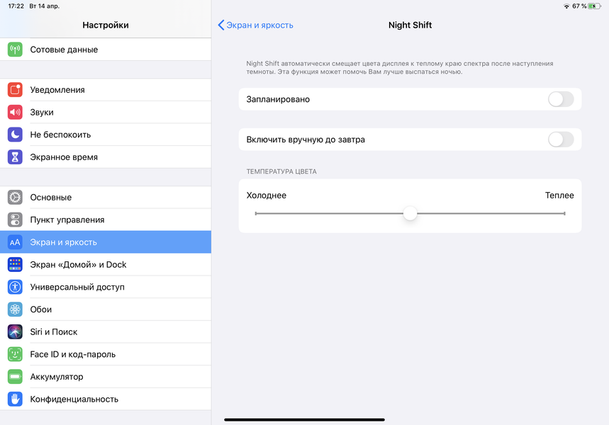 Разумеется, в этом устройстве Apple есть уже привычная функция Night Shift, которая ночью делает картинку теплее (насколько теплее — указывает пользователь, по факту это от 6270 К до 2790 К). Описание того, почему такая коррекция может быть полезной, приведено в статье про iPad Pro 9,7″. В любом случае, при развлечении с планшетом на ночь глядя лучше снизить яркость экрана до низкого, но еще комфортного уровня, а желтить экран настройкой Night Shift нет никакого смысла.