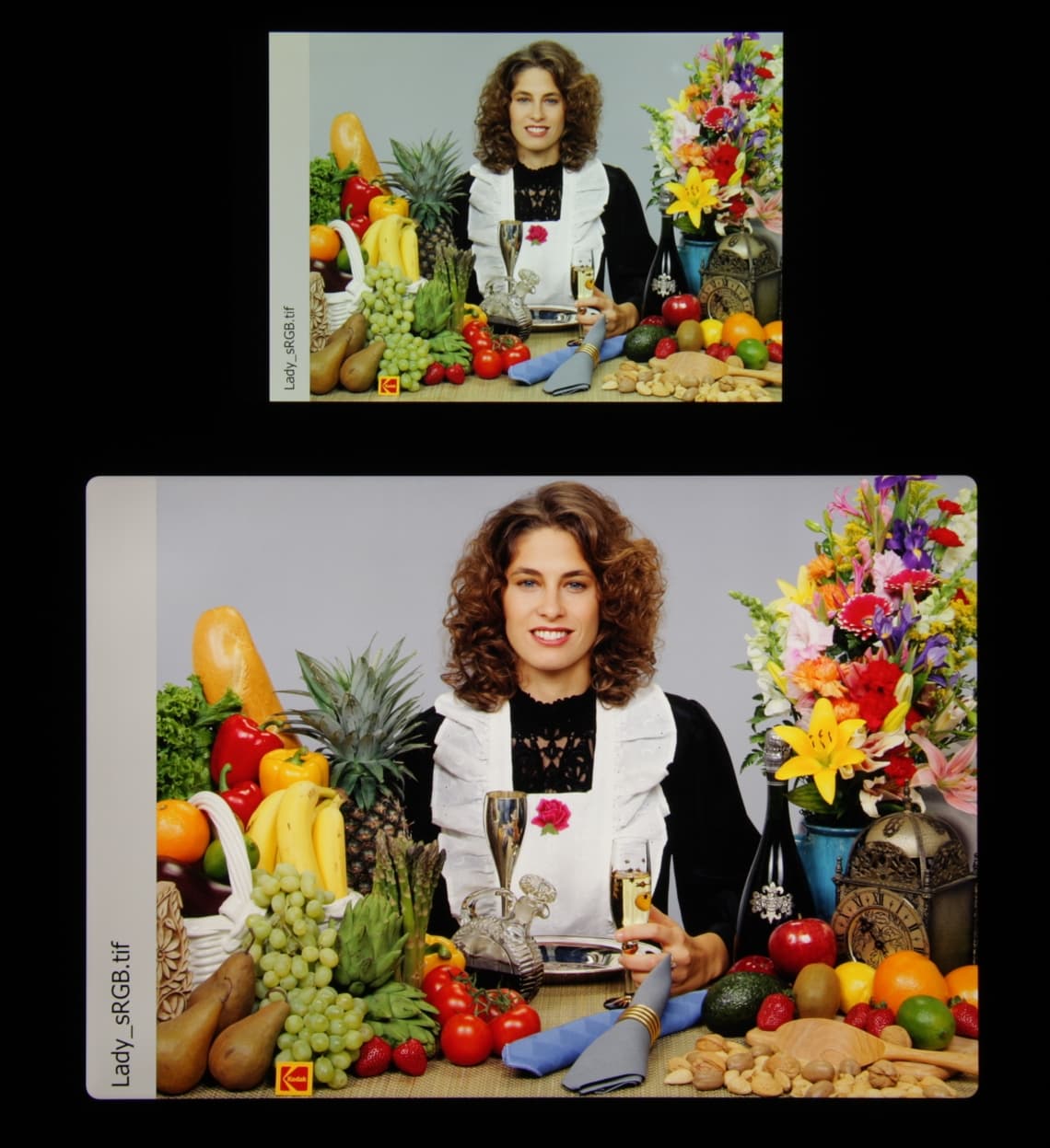 Эта коррекция выполняется в случае тех изображений, в которых прописан профиль sRGB или не прописано вообще никакого профиля. Однако родным для топовых современных устройств Apple является цветовое пространство Display P3 с более насыщенными зеленым и красным цветами. Пространство Display P3 основано на SMPTE DCI-P3, но имеет точку белого D65 и гамма-кривую с показателем примерно 2,2. Кроме того, производитель заявляет, что начиная с iOS 9.3 на системном уровне поддерживается управление цветом, это помогает приложениям под iOS правильно выводить на экран изображения с прописанным цветовым профилем. Действительно, дополнив тестовые изображения (файлы JPG и PNG) профилем Display P3, мы получили цветовой охват шире sRGB (вывод в Safari):