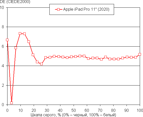 Баланс оттенков на шкале серого хороший, так как цветовая температура близка к стандартным 6500 К, а отклонение от спектра абсолютно черного тела (ΔE) меньше 10, что для потребительского устройства считается приемлемым показателем. При этом цветовая температура и ΔE мало изменяются от оттенка к оттенку — это положительно сказывается на визуальной оценке цветового баланса. Характер изменения величин от оттенка к оттенку косвенно показывает, что используется программная коррекция цветопередачи. (Самые темные области шкалы серого можно не учитывать, так как там баланс цветов не имеет большого значения, да и погрешность измерений цветовых характеристик на низкой яркости большая.)