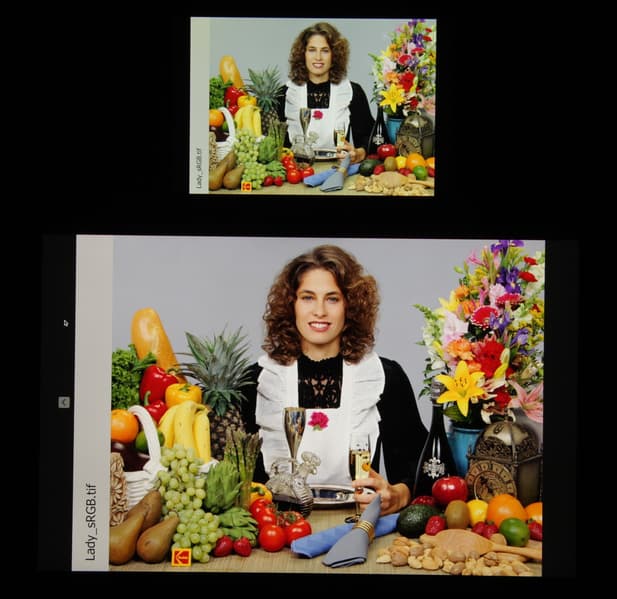 Подведем итоги. Экран ноутбука имеет очень высокую максимальную яркость (510 кд/м²) и обладает великолепными антибликовыми свойствами, поэтому устройством без проблем можно будет пользоваться вне помещения даже летним солнечным днем. В полной темноте яркость можно понизить до комфортного уровня. Допустимо использовать и режим с автоматической подстройкой яркости, работающий адекватно. К достоинствам экрана можно причислить отсутствие мерцания подсветки, очень хорошую равномерность черного поля, хорошую стабильность черного к отклонению взгляда от перпендикуляра к плоскости экрана и высокую контрастность (1300:1). В совокупности с поддержкой со стороны ОС на экране по умолчанию правильно отображаются картинки с прописанным профилем sRGB или без него (считается, что они тоже sRGB), а вывод изображений с более широким охватом возможен в границах охвата Display P3. Недостатков у экрана нет.