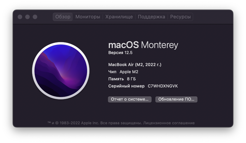 Объем оперативной памяти LPDDR5 в нашей модели составляет 8 ГБ, емкость SSD — 256 ГБ. Это самая дешевая из возможных конфигураций MacBook Air 2022. В США цена на нее составляет $1199.