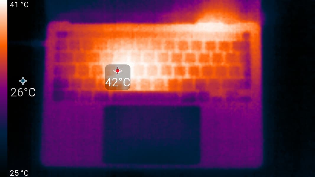 Максимальный нагрев — это две области: условно в центре клавиатуры, а также выше и правее, где выходит горячий воздух. Там, где обычно располагаются запястья пользователя, нагрев незначительный (но все же он чувствуется), что повышает комфорт от работы за ноутбуком.