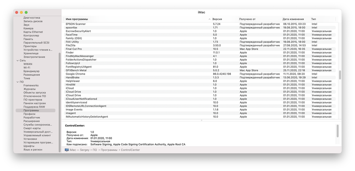Есть и второй способ узнать тип программы. Для этого надо кликнуть на иконку Apple в левом верхнем углу, выбрать Об этом Mac / Отчет о системе / Программы. И в списке в столбце «Тип» будет указано, универсальная ли это программа или только для Intel (x86). На скриншоте ниже видно, что все предустановленные программы, разработанные Apple, помечены как универсальные.