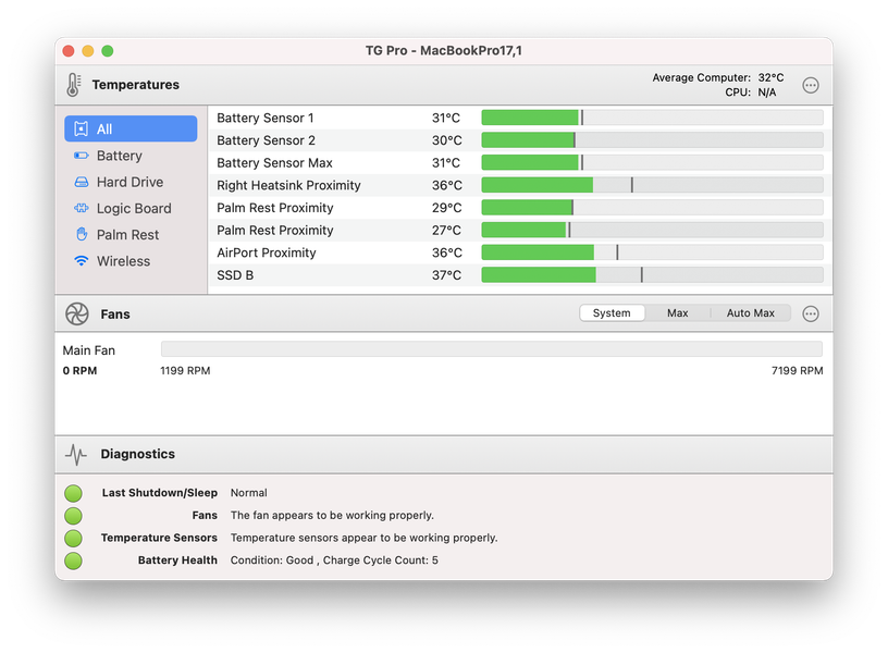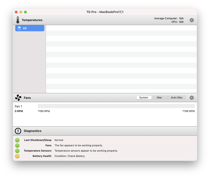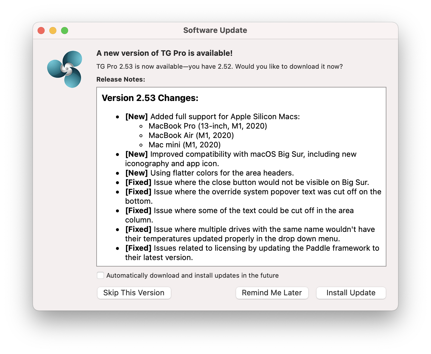 Мы интенсивно использовали MacBook несколько дней и за это время не нашли ни одного macOS-приложения, которое бы не запустилось и не стало работать на Apple M1. Но, например, утилита Tunabelly TG Pro, предназначенная для контроля за нагревом и работой вентиляторов Mac, до обновления не могла нормально функционировать. То есть формально она работала, а фактически была бесполезна.