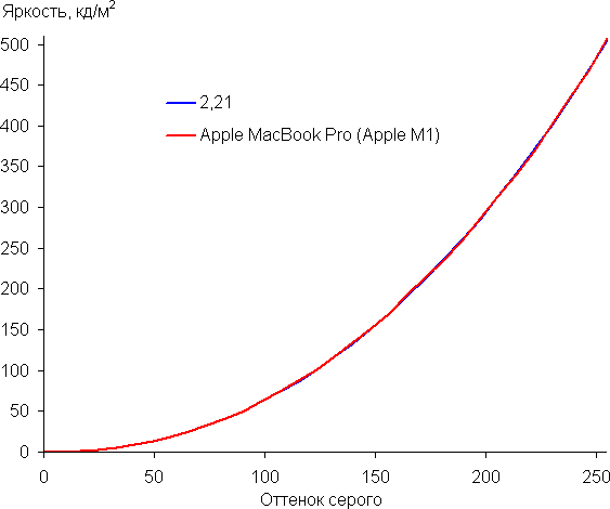 Построенная по 32 точкам с равным интервалом по численному значению оттенка серого гамма-кривая не выявила завала ни в светах, ни в тенях. Показатель аппроксимирующей степенной функции равен 2,21, что очень близко к стандартному значению 2,2. При этом реальная гамма-кривая мало отклоняется от степенной зависимости: