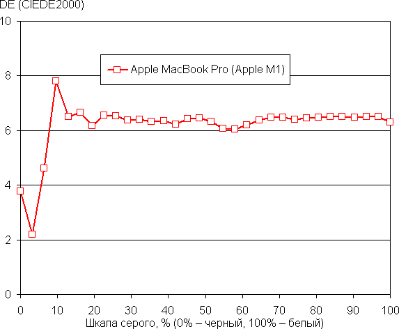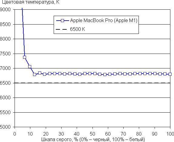 Баланс оттенков на шкале серого хороший, так как цветовая температура близка к стандартным 6500 К, а отклонение от спектра абсолютно черного тела (ΔE) меньше 10, что для потребительского устройства считается приемлемым показателем. При этом цветовая температура и ΔE мало изменяются от оттенка к оттенку — это положительно сказывается на визуальной оценке цветового баланса. (Самые темные области шкалы серого можно не учитывать, так как там баланс цветов не имеет большого значения, да и погрешность измерений цветовых характеристик на низкой яркости большая.)
