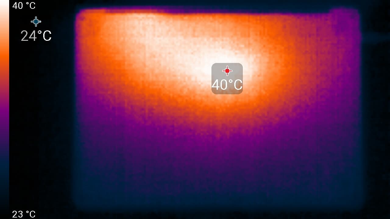 Ниже приведены теплоснимки, полученные после 30 минут работы программы Yes!, запущенной в количестве экземпляров, равном числу ядер CPU; одновременно с ней работал и 3D-тест FurMark. Яркость экрана установлена на максимум, температура в помещении поддерживается на уровне 24 градусов, но ноутбук специально не обдувается, поэтому в непосредственной близости от него температура воздуха может быть выше.