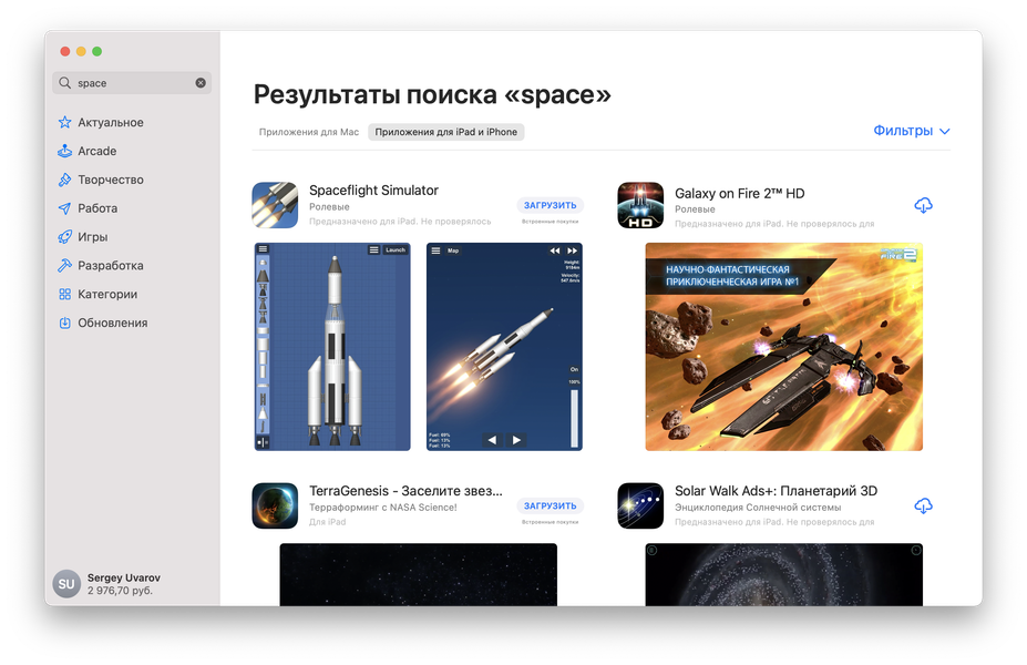 Отдельная очень интересная тема — запуск iOS-приложений на MacBook Pro. При поиске в Mac App Store вы теперь видите две вкладки: «Приложения для Mac» и «Приложения для iPad и iPhone». Причем если последние были куплены у вас на iOS, то вы можете бесплатно загрузить их и на Mac (с того же аккаунта, разумеется).