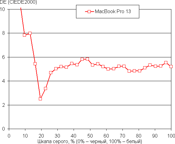 Баланс оттенков на шкале серого хороший, так как цветовая температура близка к стандартным 6500 К, а отклонение от спектра абсолютно черного тела (ΔE) меньше 10, что для потребительского устройства считается приемлемым показателем. При этом цветовая температура и ΔE мало изменяются от оттенка к оттенку — это положительно сказывается на визуальной оценке цветового баланса. (Самые темные области шкалы серого можно не учитывать, так как там баланс цветов не имеет большого значения, да и погрешность измерений цветовых характеристик на низкой яркости большая.)