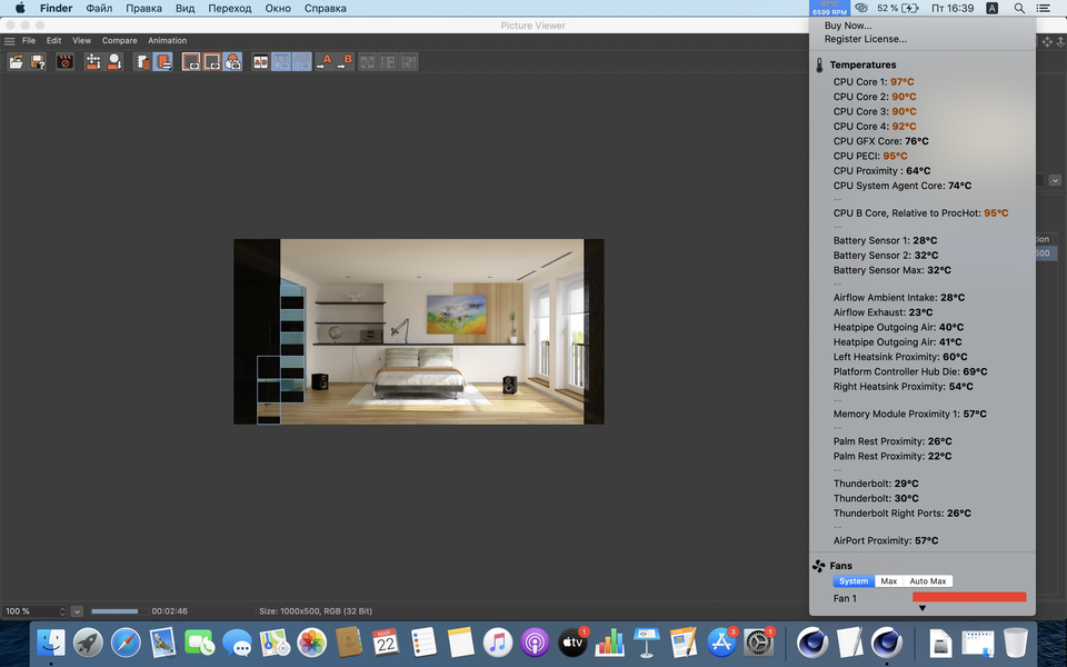 Перегрев, однако, наблюдался и при 3D-рендеринге. На скриншоте ниже обратите внимание на работу вентилятора (шкала внизу; в норме она зеленая).