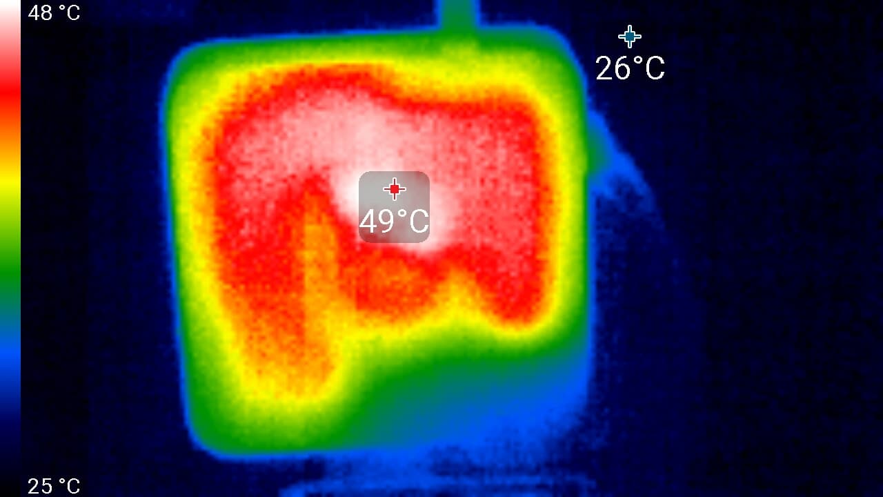 Нагрев снизу не очень высокий. Но если держать ноутбук на коленях, то тепло чувствуется, в жару так работать будет некомфортно. Потребление от сети (аккумулятор предварительно заряжен до 100%) в этом тесте равно 61 Вт. Блок питания при этом нагрелся до весьма существенной температуры, поэтому при долговременной работе с высокой нагрузкой обязательно нужно следить, чтобы он не был чем-то накрыт.